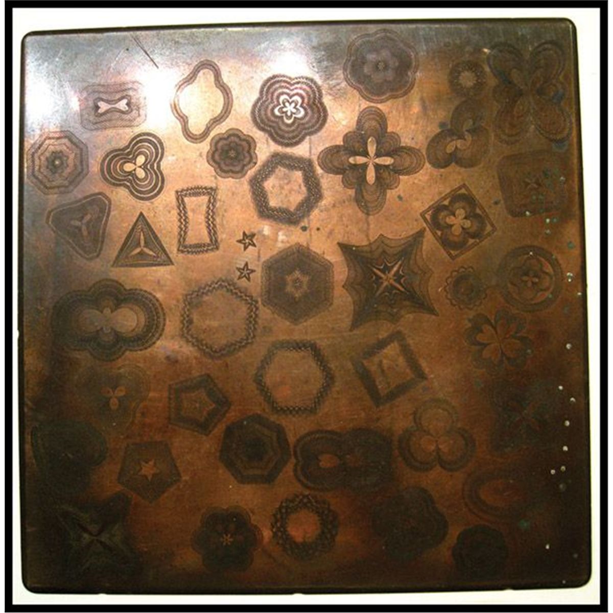 Philadelphia, Pennsylvania, ND (ca.1820's), Copper printing plate with over 40 ornate cycloid engravings on 6 by 6 inch copper plate. Unique copper printing plate from a new estate find and the first time ever offered in public auction. The plate is in excellent condition with evidence of a cleaning sometime in the distant past. The back has Jb (Jacob) Keim imprinted on the top margin who possibly manufactured the printing plate. No engraver imprint but evidently from an early Philadelphia engraver and from the same estate that the William Kneass plates are from.