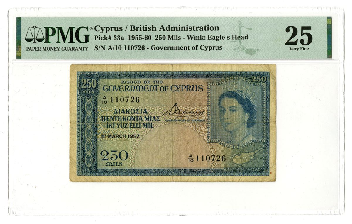 Cyprus, 1957, 250 Mils, P-33a, Issued banknote, Queen Elizabeth at right, Blue on m/c, S/N A/10 110726, PMG graded Very Fine 25 with note of minor rust. Attractive and scarce note.