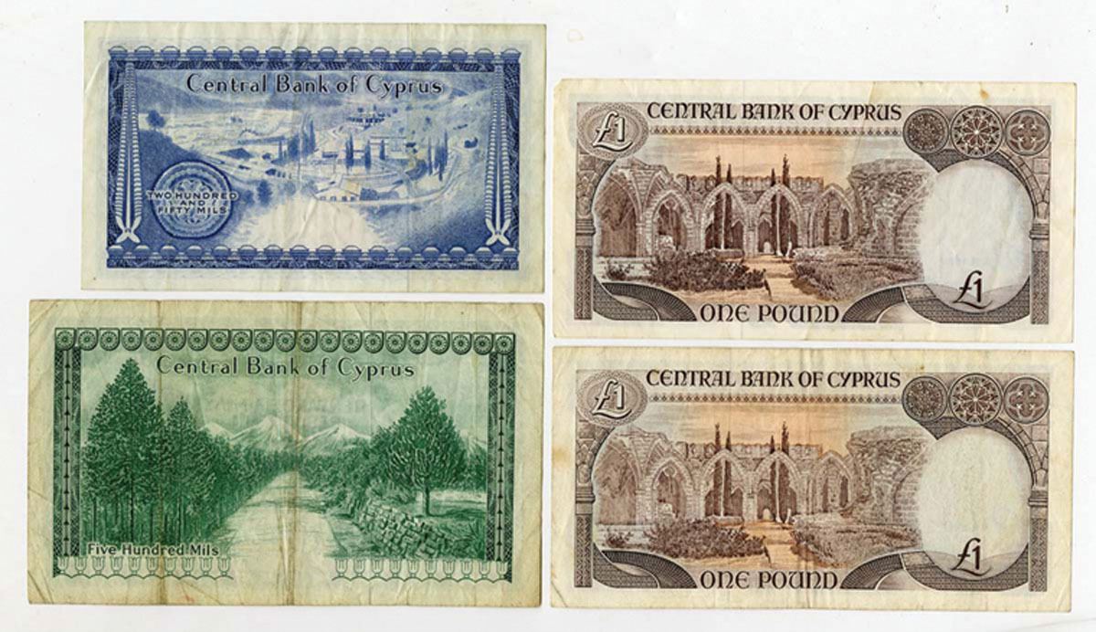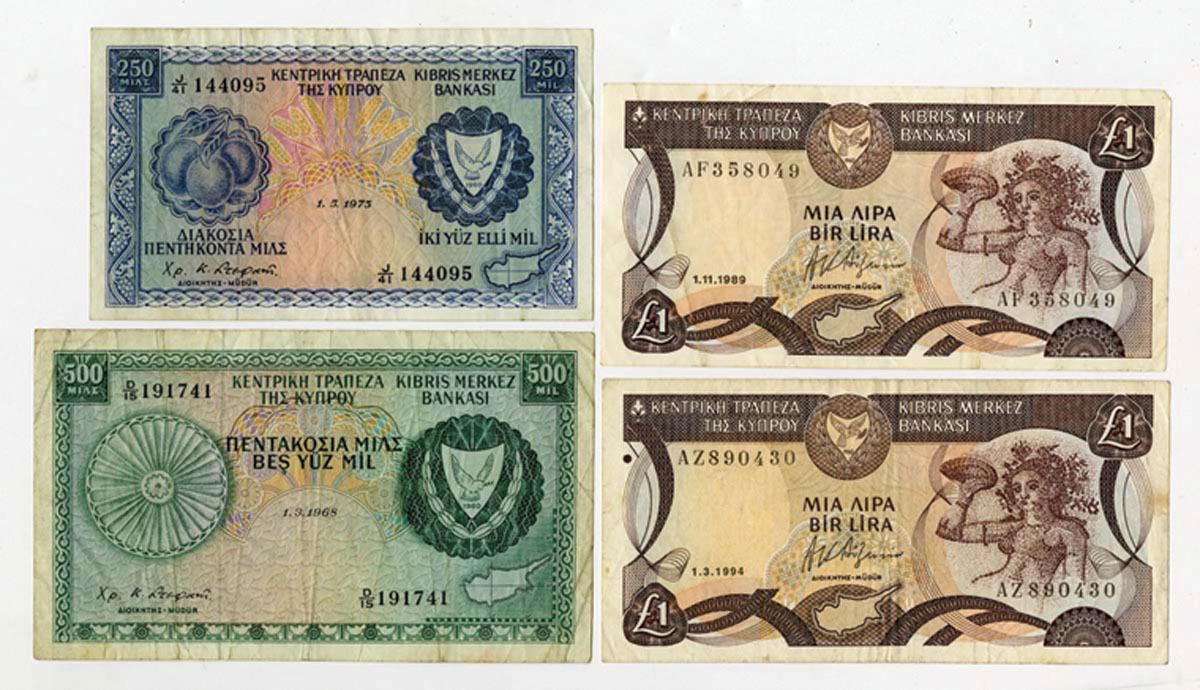 Cyprus, 1968-94. Lot of 4 Issued Banknotes, Includes: 250 Mils, P-41b, 1973; 500 Mils, P-42a, 1968; 1 Pound, P-53a & P-53c. Notes range from Fine-VF condition. (4).