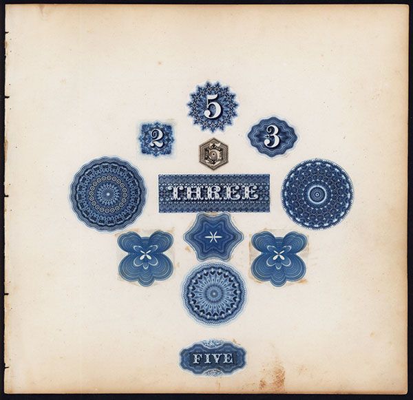 ND (ca.1820-40's), 10x10 inch unique artistic vignette sheet in mostly blue with counters, cycloidal lathe engravings, rectangular, circular and odd intricate engravings and numerals, This page was Page 26 of 96 different pages saved in Durand's personal engraving book. All are cut down proofs on india mounted to card by Durand. Durand was responsible for the direction that security printing and engraving took in the United States and was the holder of many patents that allowed the engraver to practice his art at a new level that made it more difficult to counterfeit banknotes. (ex The 52 Collection, Part 1, 06-29-10).