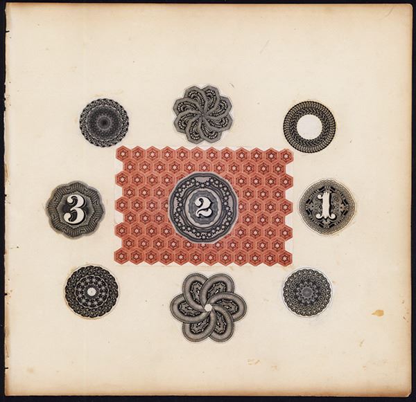 ND (ca.1820-40's), 10x10 inch unique artistic vignette sheet with counters, cycloidal engravings, hexagonal cycloidal engravings and numerals in black and red, This page was Page 64 of 96 different pages saved in Durand's personal engraving book. All are cut down proofs on india mounted to card by Durand. Durand was responsible for the direction that security printing and engraving took in the United States and was the holder of many patents that allowed the engraver to practice his art at a new level that made it more difficult to counterfeit banknotes. (ex The 52 Collection, Part 1, 06-29-10).