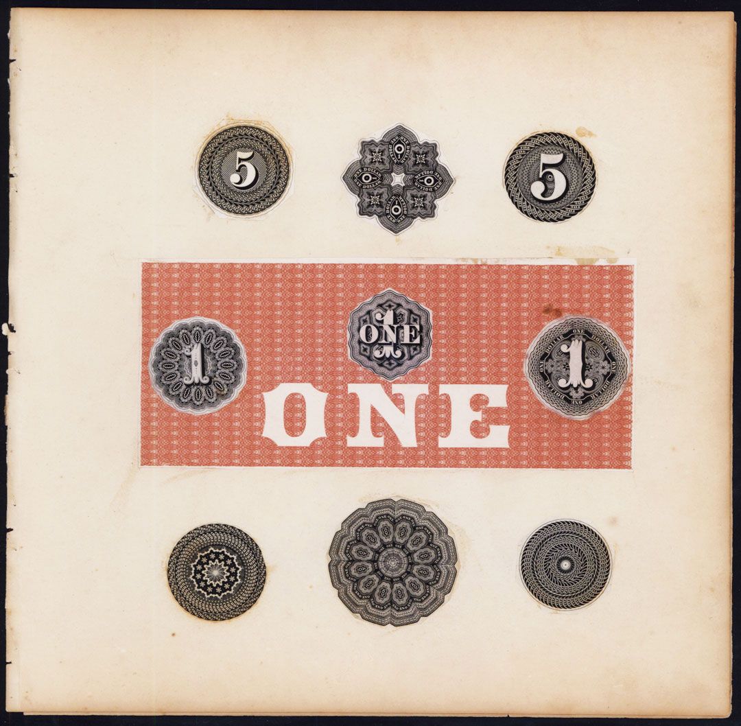 ND (ca.1820-40's), 10x10 inch unique artistic vignette sheet in red and black with banknote sized undertint with numeral counters and protectors on top of it as well as cycloidal lathe engraved counters in rectangular, circular and odd intricate shapes with intricate engraving, This page was Page 80 of 96 different pages saved in Durand's personal engraving book. (ex The 52 Collection, Part 1, 06-29-10).