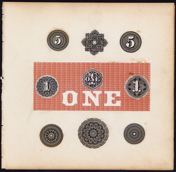 ND (ca.1820-40's), 10x10 inch unique artistic vignette sheet in red and black with banknote sized undertint with numeral counters and protectors on top of it as well as cycloidal lathe engraved counters in rectangular, circular and odd intricate shapes with intricate engraving, This page was Page 80 of 96 different pages saved in Durand's personal engraving book. All are cut down proofs on india mounted to card by Durand. Durand was responsible for the direction that security printing and engraving took in the United States and was the holder of many patents that allowed the engraver to practice his art at a new level that made it more difficult to counterfeit banknotes. (ex The 52 Collection, Part 1, 06-29-10).