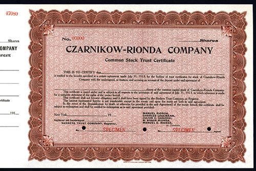 New York, 191x (ca.1910's), Specimen Stock, Odd Shares, Black on red-brown border and underprint, No vignette, VF-XF condition, ABNC. Manuel Rionda, Charles Lagemann, Jules Ganzoni, B. Braga Rionda, Manuel E. Rionda listed on stock as trustees. One of the largest North American Sugar brokers for over a century. The company was formed in 1909 and dissolved in 1999. Manuel Rionda joined Czarnikow-MacDougall sugar brokers based out of England and New York in 1897. When the founding partner, Czarnikow died the company name was changed to Czarnikow-Rionda. In its heyday the company controlled almost 60% of the U.S sugar trade.