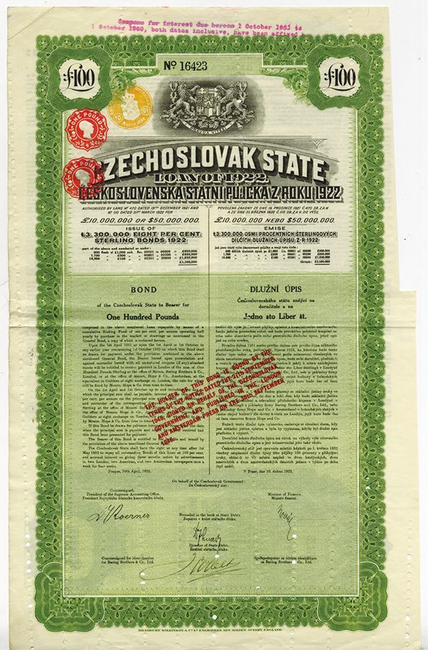 Czechoslovak State. £100 Issued and Cancelled 1% General Coupon Bond, Black print on green border and under tint printed in English and Czech, Country seal at top, Fine-VF condition, POC's along bottom, Bradbury Wilkinson & Co.