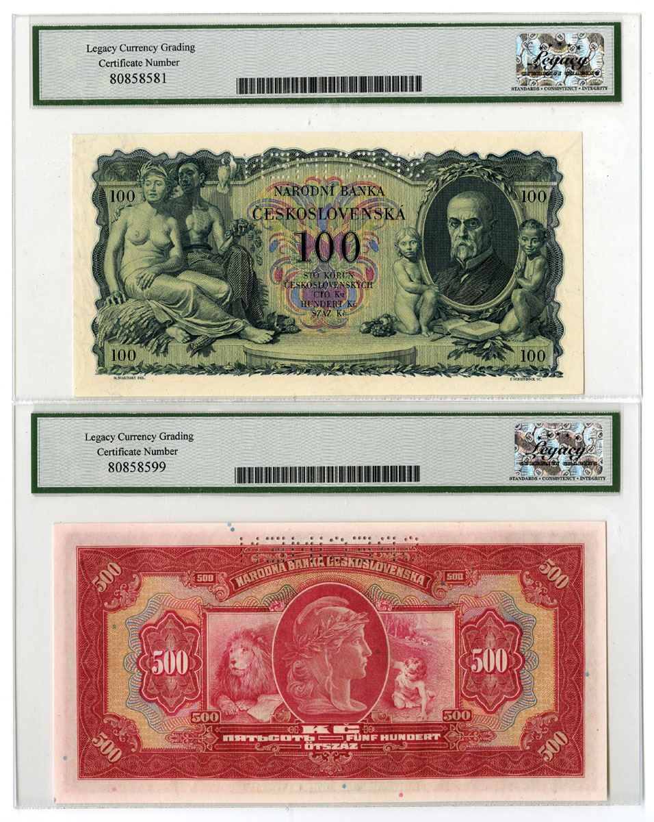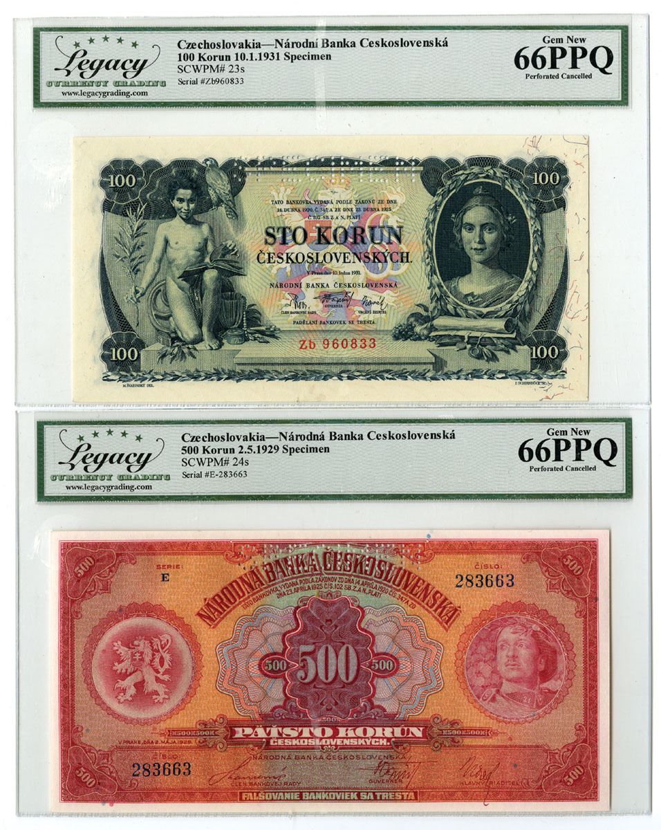 Czechoslovakia, 1929-31. Lot of 2 Specimen Banknotes, Includes: 100 Korun, P-23s, 1931, S/N Zb960833; 500 Korun, P-24s, 1929, S/N E-283663. Both are Legacy graded Gem New 66PPQ with comment "Perforated Cancelled," and printed TB. (2). Sold "AS IS" no returns accepted.