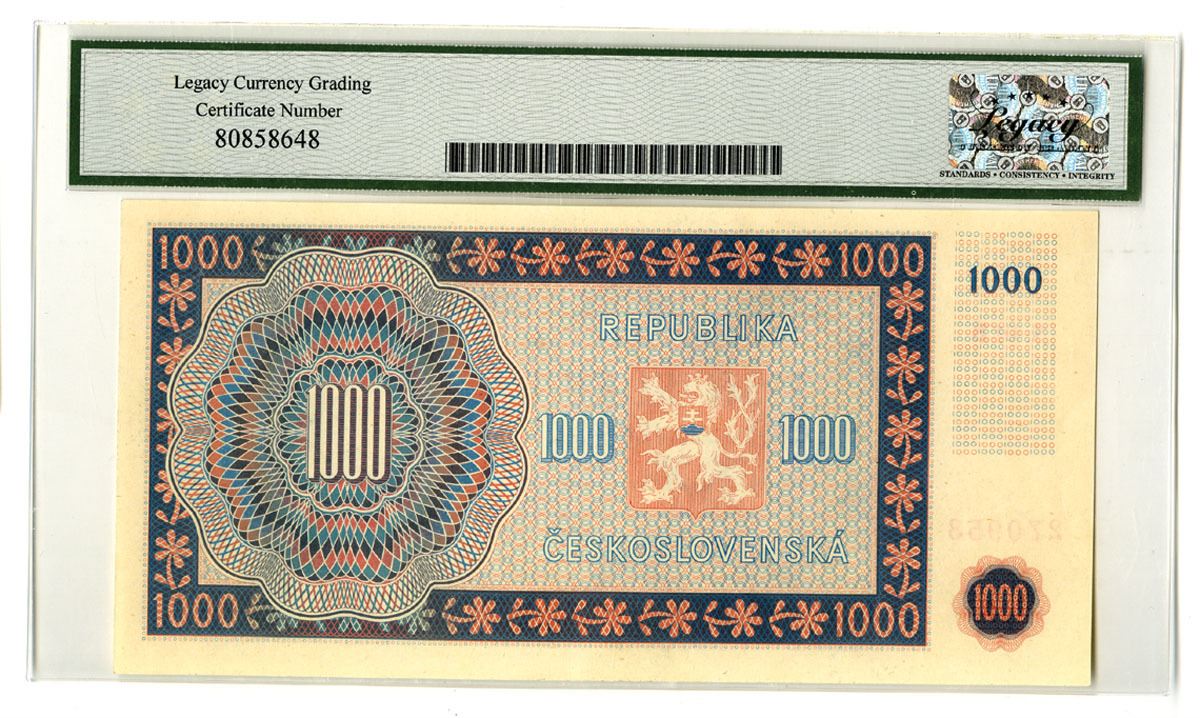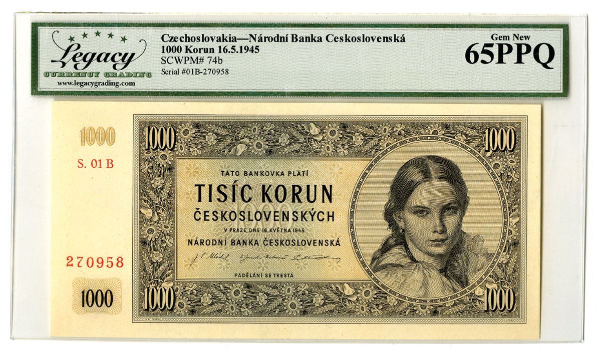 Czechoslovakia, 1945. 1000 Korun, P-74b, Issued Banknote, Dark grayish brown on gray underprint, Head of Jana Dvorakova by Josef Manes at right, Back is blue with red-orange and m/c printing with arms at center, S/N 01B-270958, Legacy graded Gem New 65PPQ, TB.