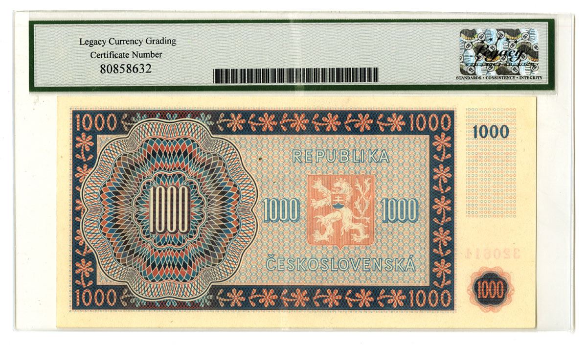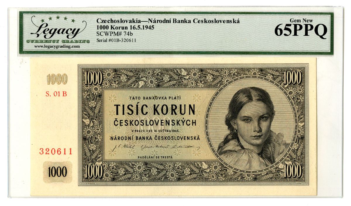 Czechoslovakia, 1945. 1000 Korun, P-74b, Issued Banknote, Dark grayish brown on gray underprint, Head of Jana Dvorakova by Josef Manes at right, Back is blue with red-orange and m/c printing with arms at center, S/N 01B-320611, Legacy graded Gem New 65PPQ, TB.