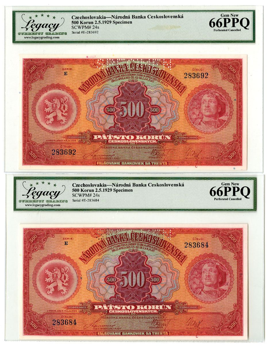 Czechoslovakia...,Lot of 2 notes, both are 1929. 500 Korun, P-24s (2), Specimen Banknote Pair, Red on m/c underprint with arms at left and WWI Czech Legionnaire at right, Back is red on m/c with lion and child flanking liberty head at center, S/Ns E-283684 and E-283692, Both have Specimen pin punches and are both Legacy graded Gem New 66PPQ, TB. (2). Sold "AS IS" no returns accepted.