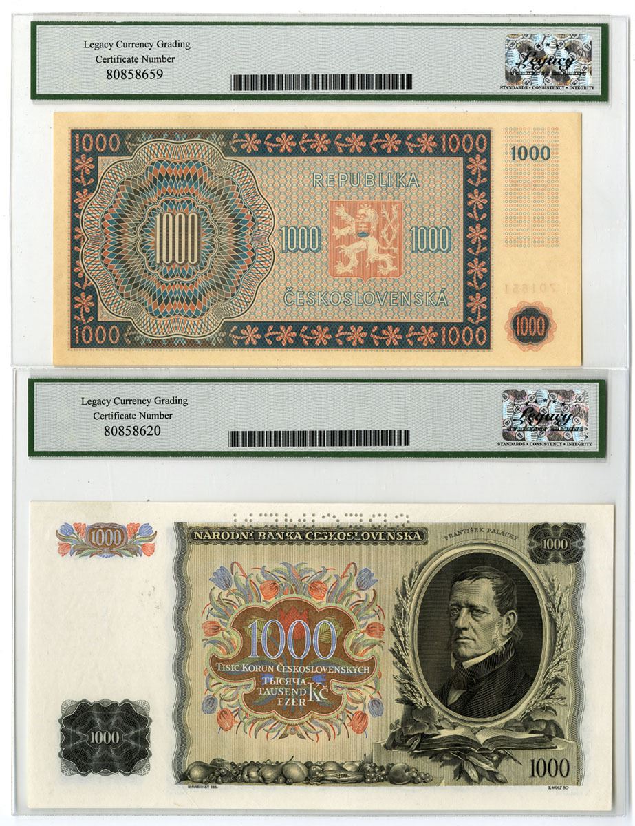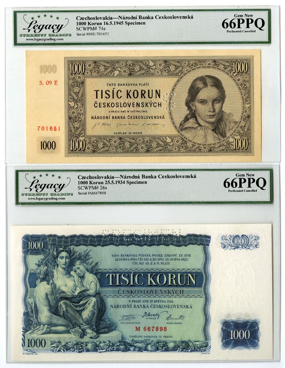 Czechoslovakia, 1934-45. Lot of 2 Specimen and Issued Banknotes, Includes: 1000 Korun, P-26s, 1934, Pin punched Specimen at top, S/N M473511; 1000 Korun, P-74s, 1945, Pin punch 'S' at center, S/N 09E-701651. Both are Legacy graded Superb Gem New 66PPQ with comment "Perforated Cancelled," TB, Prague. (2). Sold "AS IS" no returns accepted.
