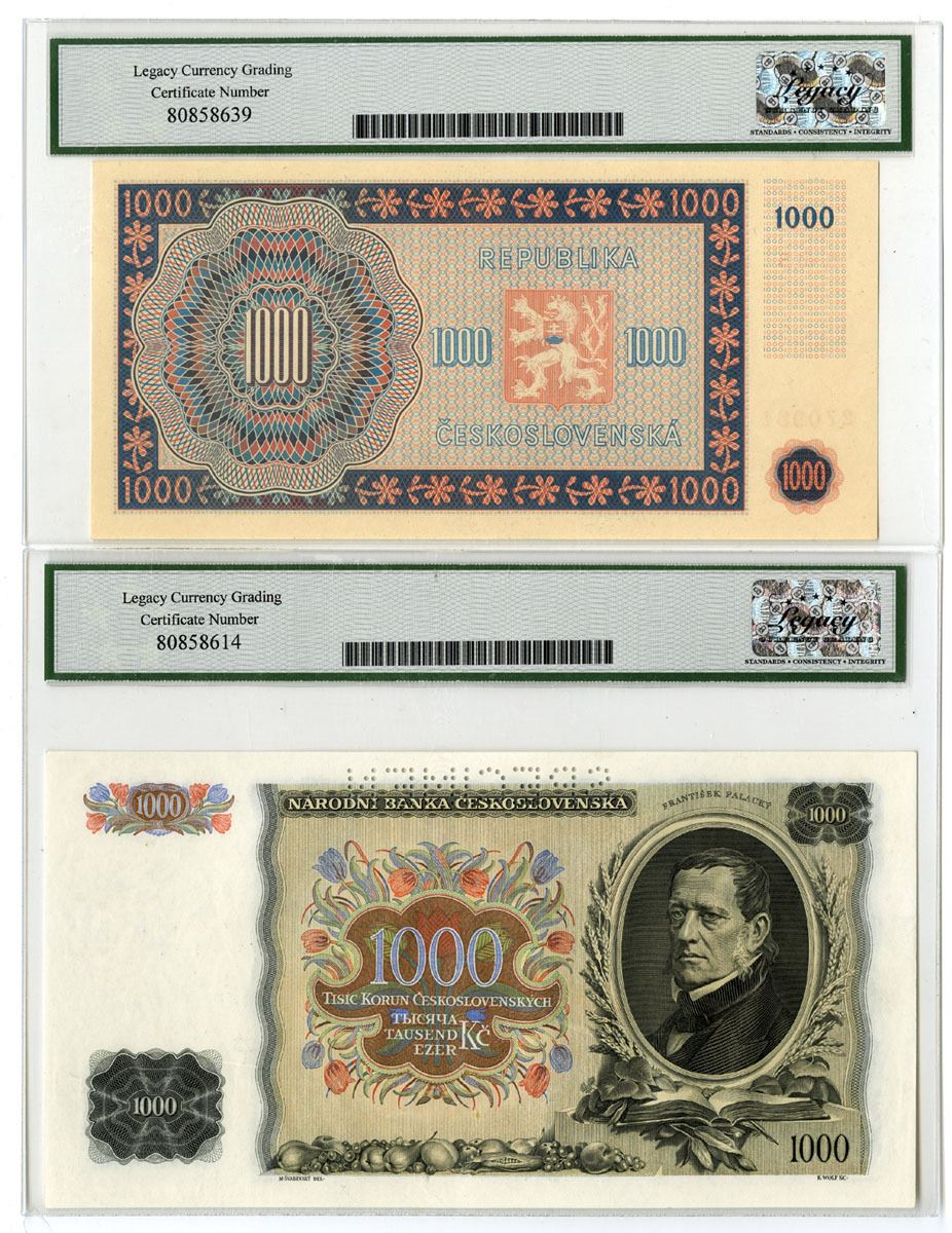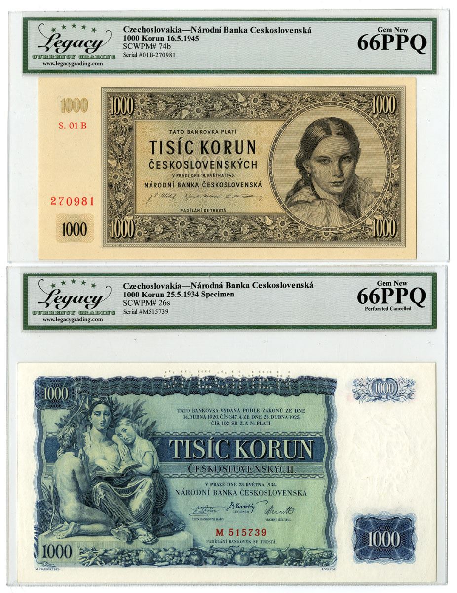 Czechoslovakia, 1934-45. Lot of 2 Specimen and Issued Banknotes, Includes: 1000 Korun, P-26s, 1934, Pin punched Specimen at top, S/N M515739; 1000 Korun, P-74b, 1945, Issued Banknote, S/N 01B-270981. Both are Legacy graded Gem New 66PPQ with comment "Perforated Cancelled" on Specimen, TB, Prague. (2). Sold "AS IS" no returns accepted.