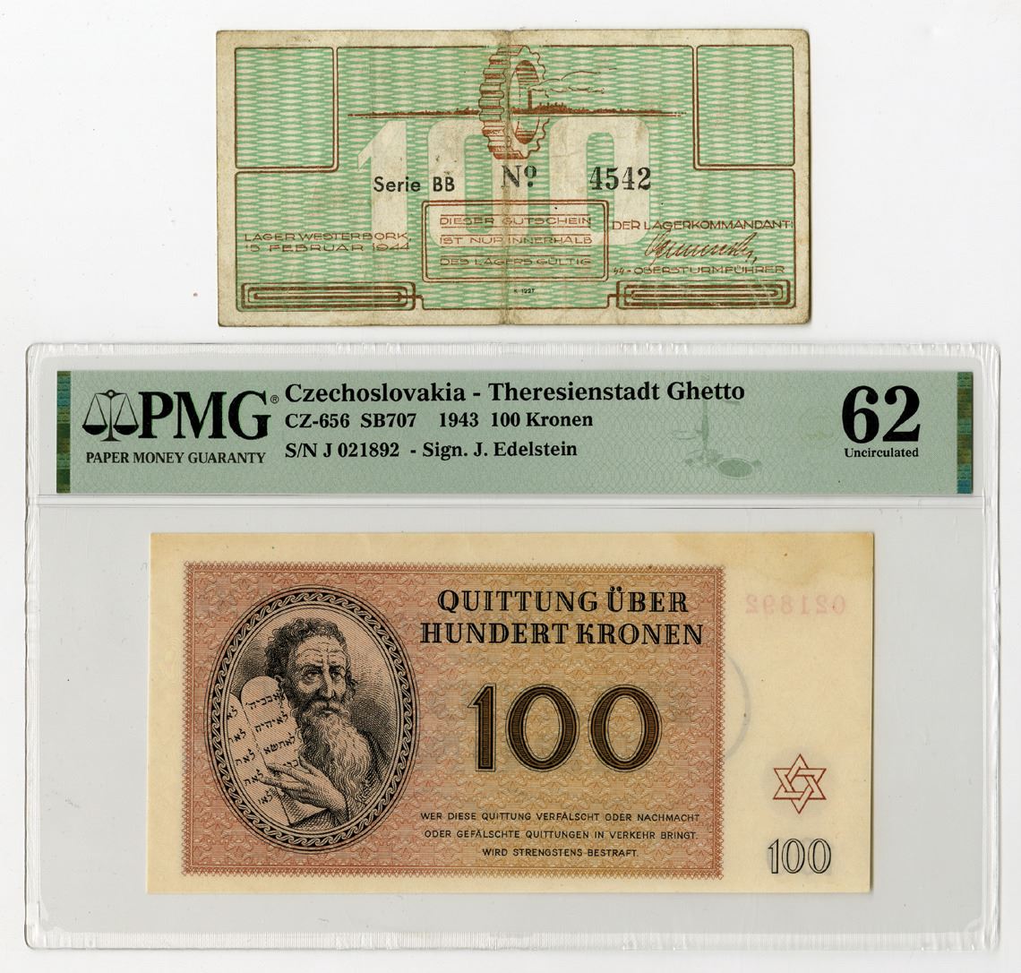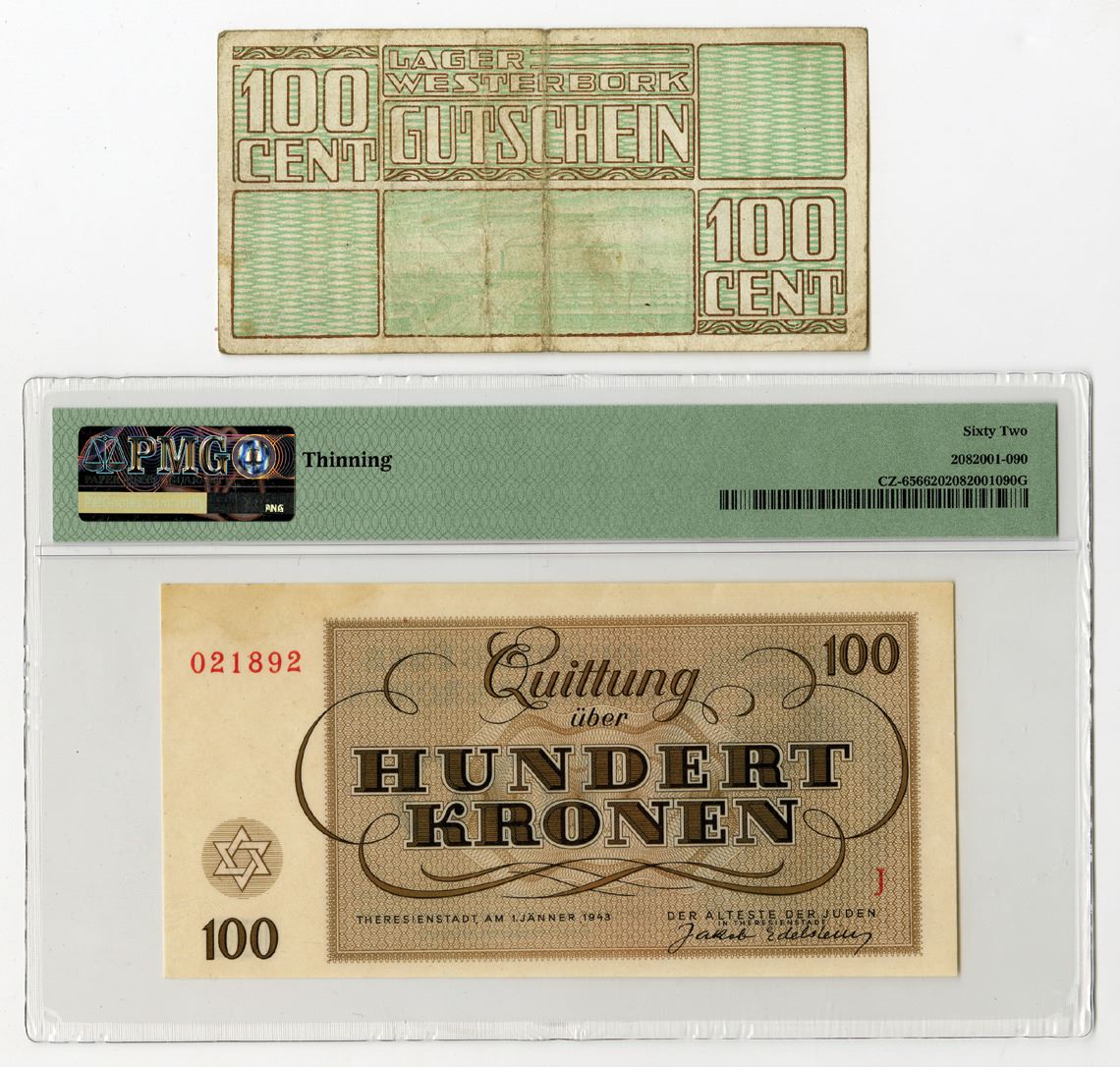 Czechoslovakia & Netherlands, 1943-44. Lot of 2 Issued Banknotes, Includes: Theresienstadt Ghetto 100 Kronen, CZ-656, SB707, 1943, Brown with Jewish star at bottom left corner, the obverse of the note shows Moses holding the 10 commandments, Signed by Jacob Edelstein (he was a Czechoslovak Zionist, social democrat and the first Jewish Elder in the Theresienstadt ghetto. He was murdered in Auschwitz-Birkenau), S/N J 021892, PMG graded Uncirculated 62 with comment "Thinning."; and, Lager Westerbork Gutschein, 100 Cents Scrip Note for Westerbork WWII Camp, 1944, Black and brown text on green underprint, Series BB, S/N 4542. Camp Westerbork, also known as Westerbork transit camp, was a Nazi transit camp in the province of Drenthe in the Northeastern Netherlands, during World War II. It was located in the municipality of Westerbork, current-day Midden-Drenthe. Camp Westerbork was used as a staging location for sending Jews to concentration camps elsewhere. (2). Sold "AS IS" no returns accepted.