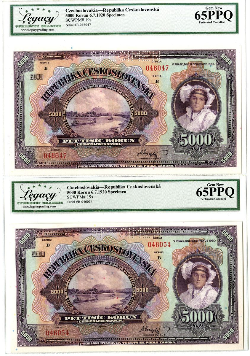 Czechoslovakia, Lot of 2 notes, both are 1920, 5000 Korun, P-19s (2), Specimen Banknote Pair, Brown-violet on m/c underprint, River Elbe with Rip mountain at left and woman in costume of Tabor at right, Back is purple and green with standing allegorical woman at center, S/Ns B-046047 and B-046054, Pin punched Specimen at top, Both are Legacy graded Gem New 65PPQ, TB. (2). Sold "AS IS" no returns accepted.