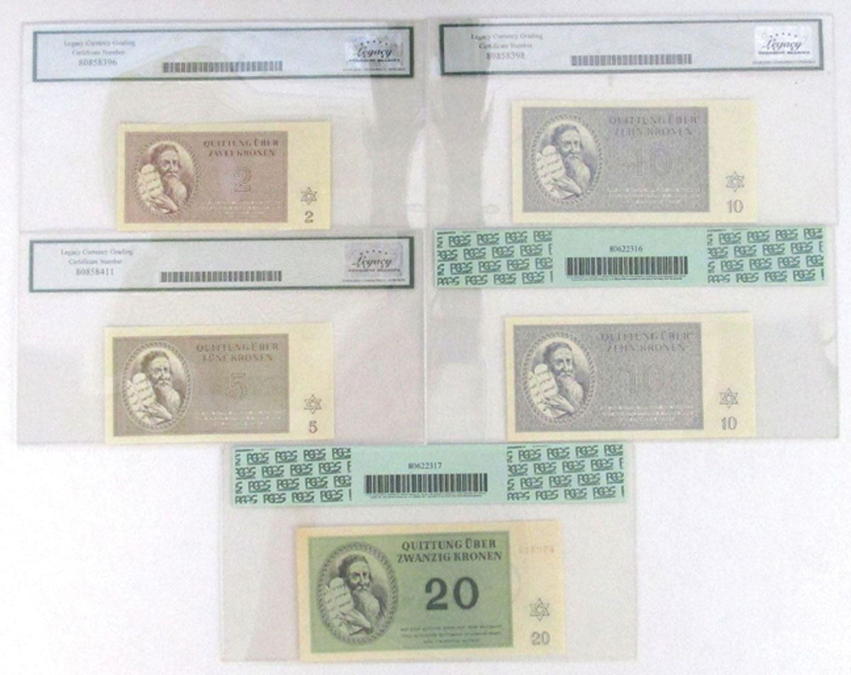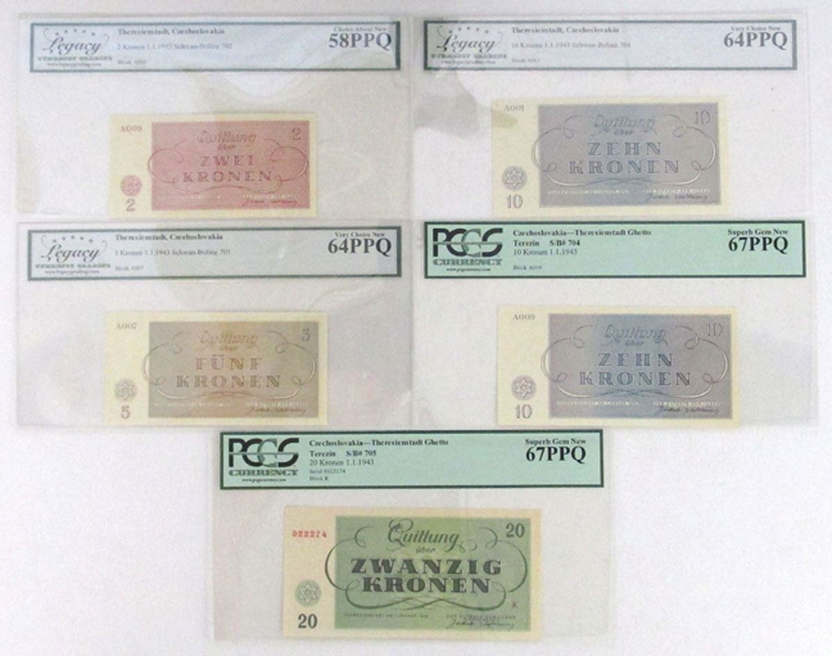Czechoslovakia....., 1943. Lot of 5 Issued Banknotes, Includes: 2 Kronen, SB 702, Block A009, Legacy graded Choice About New 58PPQ; 5 Kronen, SB 703, Block A007, Legacy graded Very Choice New 64PPQ; 10 Kronen, SB 704, Block A001, Legacy graded Very Choice New 64PPQ; 10 Kronen, SB 704, PCGS graded Superb Gem New 67PPQ; 20 Kronen, SB 705, PCGS graded Superb Gem New 67PPQ. (5). Sold "AS IS" no returns accepted.