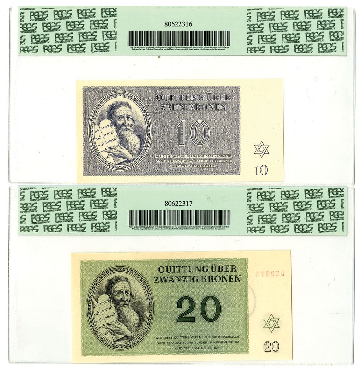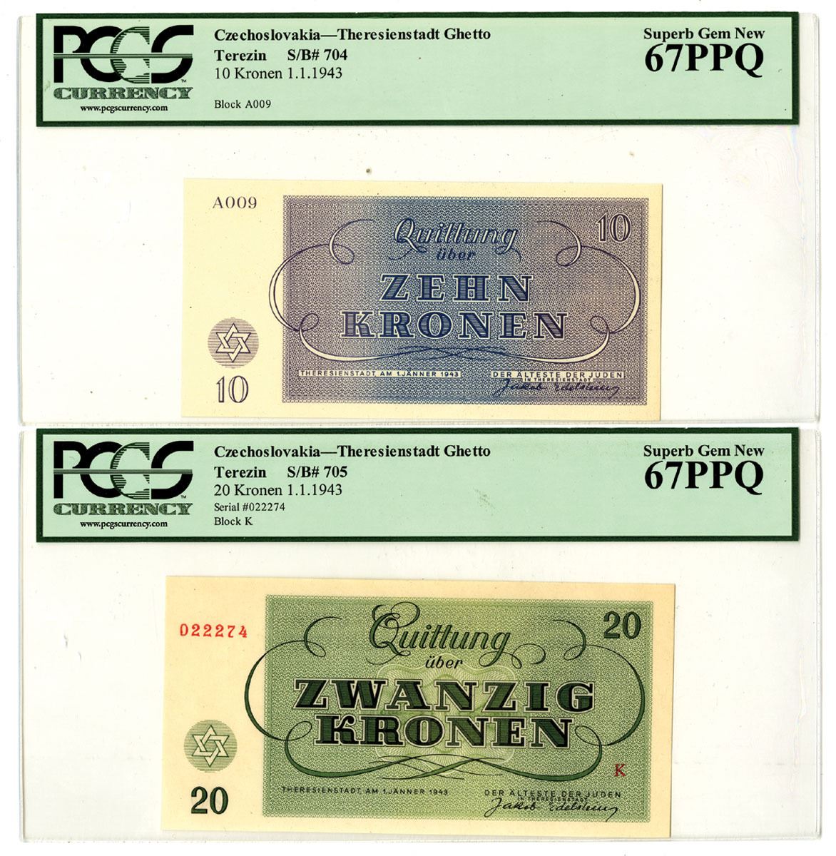 Czechoslovakia, 1943. Lot of 2 Issued Banknotes, Includes: 10 Kronen, SB 704, and 20 Kronen, SB 705. Both notes have Jewish star at bottom left corner with Moses holding the 10 commandments on back, Both notes are PCGS graded Superb Gem New 67PPQ. (2). Sold "AS IS" no returns accepted.