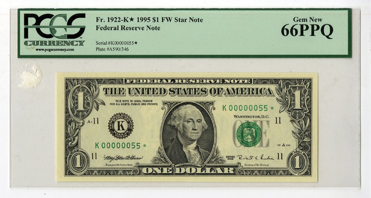 Dallas, Texas. 1995. $1, Series of 1995, P-496a, Fr.# 1922-K*, Issued Banknote, Black with George Washington at center, Green seal at right, Back is green with Great seal flanking ONE, Withrow | Reuben Signatures, S/N K00000055* pp A590/346, PCGS graded Gem New 66PPQ.