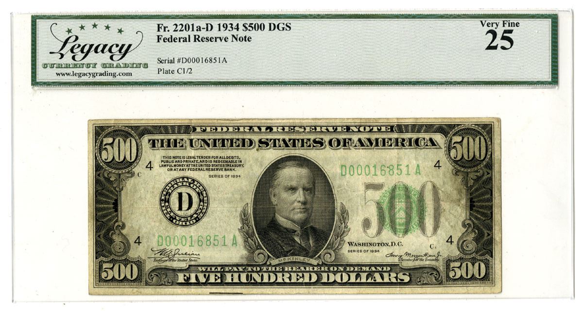 Washington, D.C., 1934. $500, P-434, Series of 1934, Fr.2201a-d, Issued Banknote, Julian | Morgenthau signatures, Bright green seal at right, S/N D00016851A pp C1/2, Legacy graded Very Fine 25.