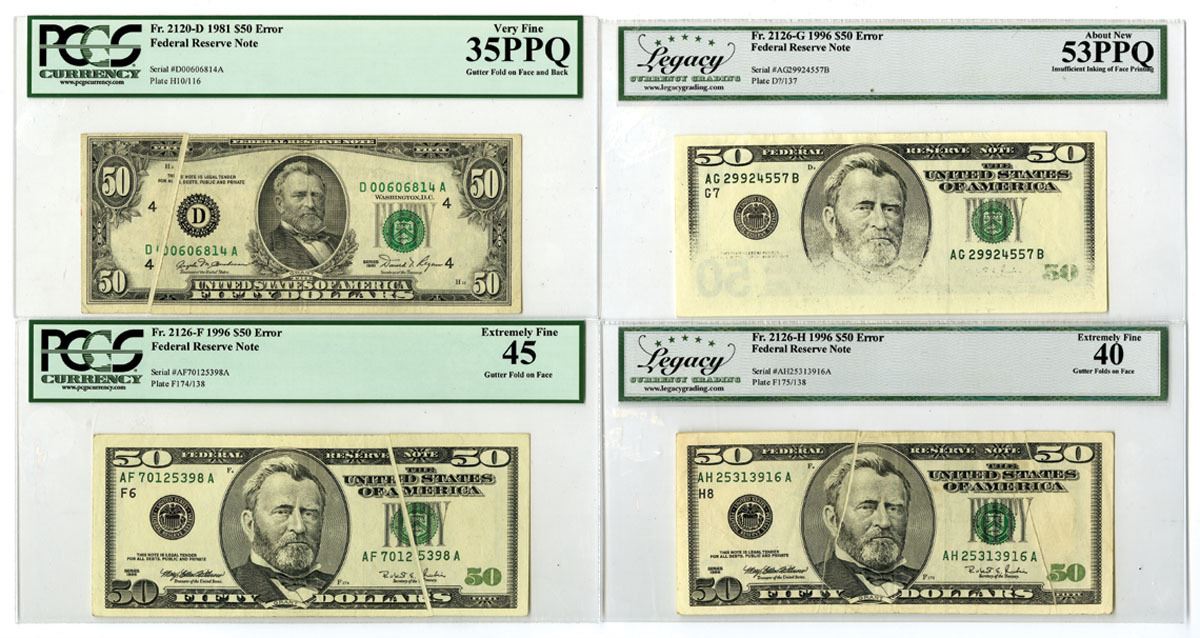 Washington, D.C., 1981 to 1996. Lot of 4 Error Banknotes, Includes: Series of 1981, $50, P-472, Fr. 2120-D, S/N D00606814A pp H10/116, PCGS graded Very Fine 35PPQ with comment "Gutter Fold on Face and Back;" Series of 1996, $50, P-502, Fr. 2126-G, S/N AG29924557B pp D?/137, Legacy graded About New 53PPQ with comment "Insufficient Inking of Face Printing;" Series of 1996, $50, P-502, Fr. 2126-F, S/N AF70125398A pp F174/138, PCGS graded Extremely Fine 45 with comment "Gutter Fold on Face;" Series of 1996, $50, P-502, Fr. 2126-H, S/N AH25313916A pp F175/138, Legacy graded Extremely Fine 40 with comment "Gutter Folds on Face." (4). Sold "AS IS" no returns accepted.