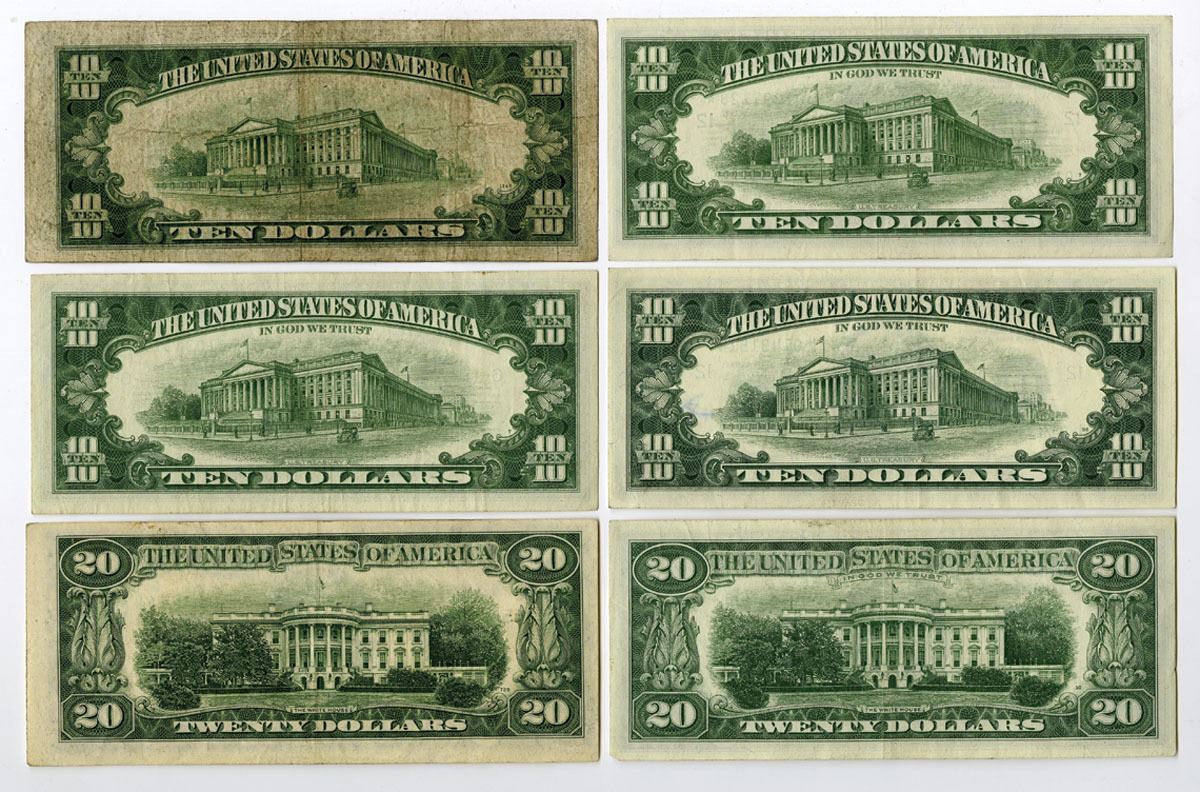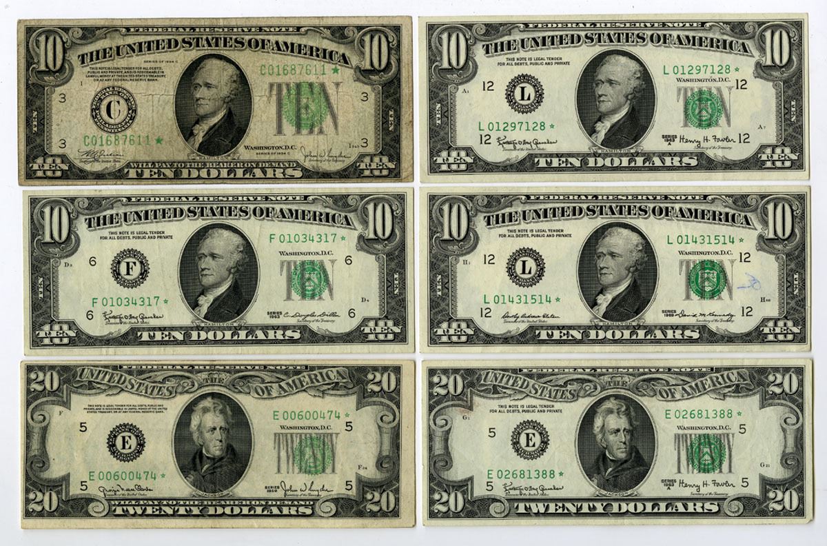 Various States, 1934 to 1969. Lot of 6 Issued Banknotes, Includes: Series of 1934C, Philadelphia, PA $10, P-430Dc, Fr.# 2008-C*, Star Note; Series of 1950, Richmond VA $20, P-440, Fr.# 2059-E*, Star Note; Series of 1963, Atlanta, GA $10, P-445a, Fr.# 2016-F*, Star Note; Series of 1963A, San Francisco, CA $10, P-445b, Fr.# 2017-L*, Star Note; Series of 1963A, Richmond, VA $20, P-446b, Fr.# 2066-E*, Star Note; Series of 1969, San Francisco, CA $10, P-451a, Fr.# 2018-L*, Star Note. Banknotes range from VF to AU condition. ($80 FV) (6). Sold "AS IS" no returns accepted.
