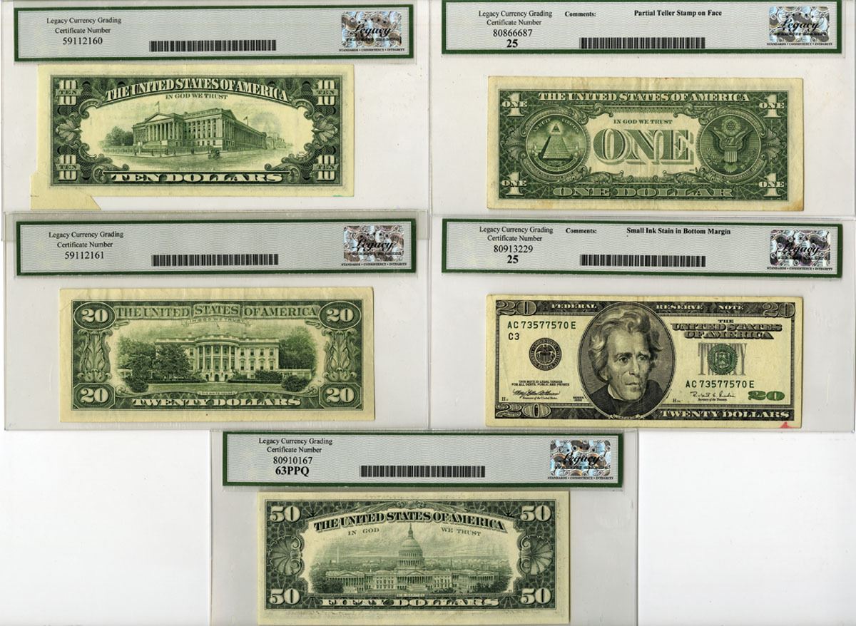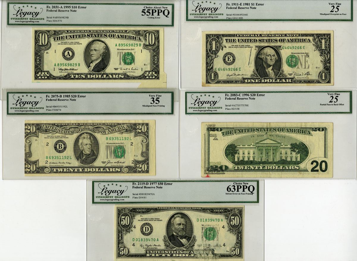 Various States, 1977 to 1996. Lot of 5 Error Banknotes, Includes: Series of 1977, Cleveland OH, $50, P-466, Fr.# 2119-D, Legacy graded Choice New 63PPQ with comment "Solvent Error on Face Printing"; Series of 1981, Richmond, VA $1, P-468, Fr.# 1911-E, Legacy graded Very Fine 25 with comment "Misaligned Overprint on Face and Partial Teller Samp on Face"; Series of 1985, New York, NY $20, P-477, Fr.# 2075-B, Legacy graded Very Fine 35 with comment "Misaligned Face Printing"; Series of 1995, Boston, MA $10, P-499. Fr.# 2031-A, Legacy graded Choice About New 55PPQ with comment "Cutting Error"; Series of 1996, $20, P-501, Fr.# 2083-C, Legacy graded Very Fine 25 with comments "Partial Face to Back Offset and Small Ink Stain in Bottom Margin." ($101 FV) (5). Sold "AS IS" no returns accepted.