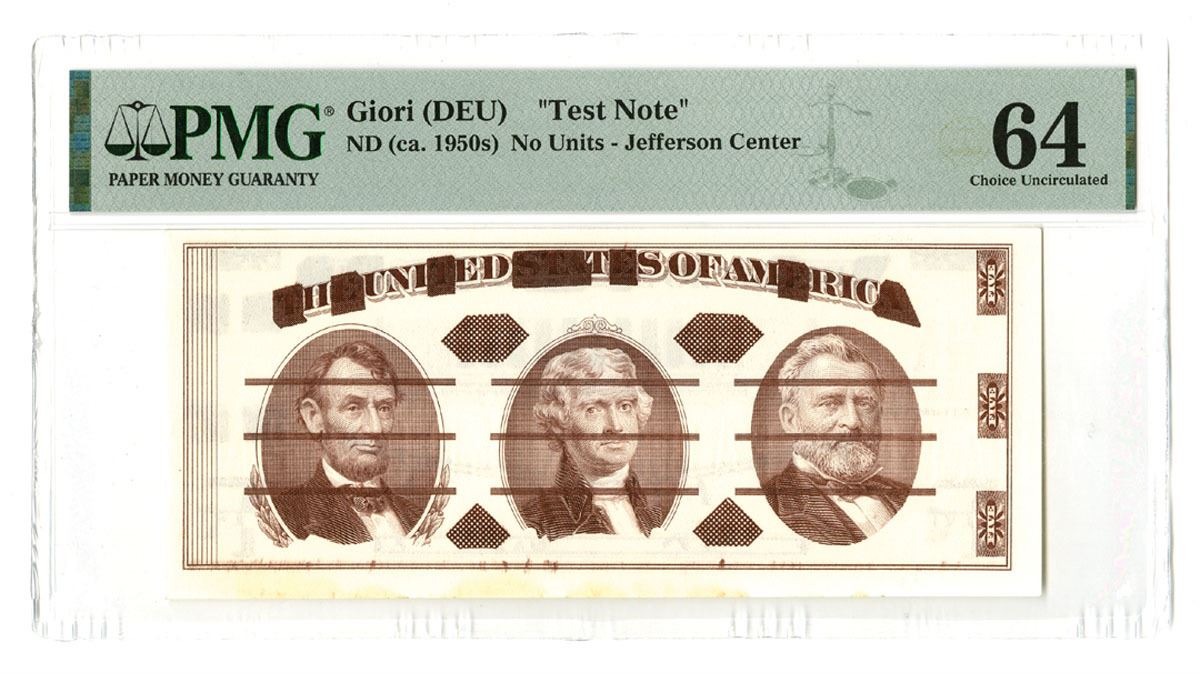 United States, ND (ca. 1950s). Jefferson Center Test Note with No Units, Mud brown Front and black back, No S/N, Watermark: None, PMG graded Choice Uncirculated 64 with comment "Minor Stains."