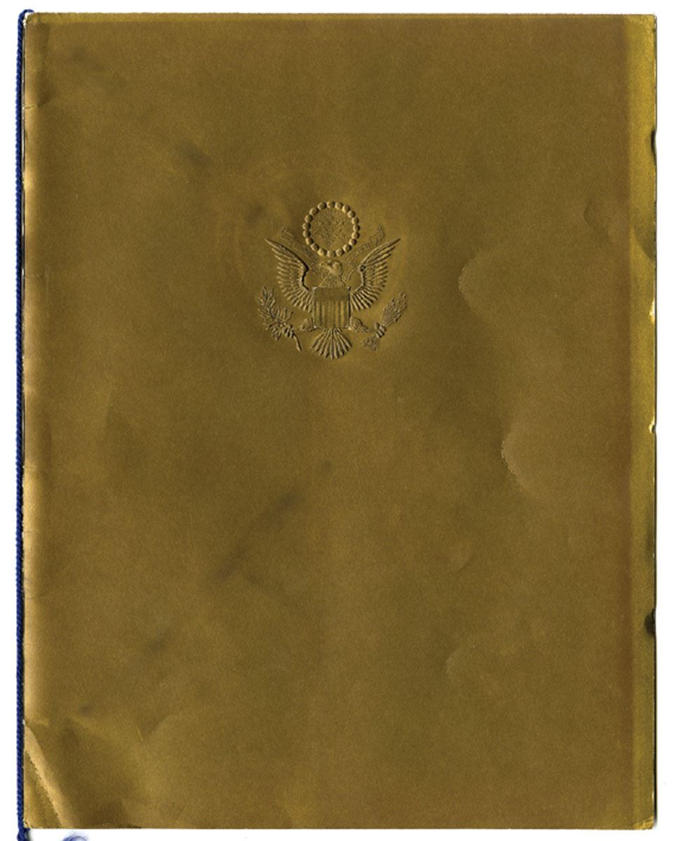 Washington D.C., January 20, 1949. Souvenir Program for the inauguration of President Harry S. Truman and Vice President Alben W. Barkley, including full-page portraits of the President, Vice President, Mrs. Truman, Miss Margaret Truman, and Mrs. Truitt. The cover is gold with a deeply embossed Presidential seal on the cover. Also lists musical performers including the U.S. Marine Band, Benny Goodman, Xavier Cugat, and Guy Lombardo, along with an extensive roster of diplomatic patrons and dignitaries. XF to AU condition.