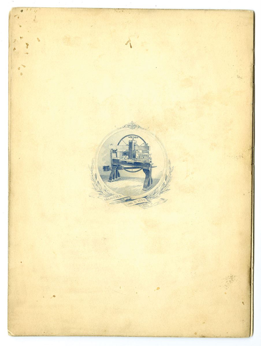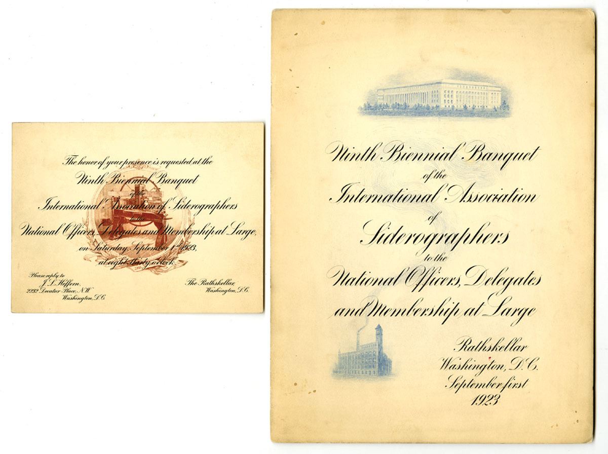 Washington D.C., 1923. Lot of 2 items. Includes: Intaglio printed program for the Ninth Biennial Banquet of the International Association of Siderographers, held at the Rathskeller, Washington, D.C., September 1, 1923, featuring engraved vignettes of the White House and U.S. Capitol on the covers together with the matching printed invitation card, decorated with an early siderography press vignette in brown. Both items show light toning and edge wear but remain attractive and historically significant examples of early 20th century union and engraving-related ephemera tied to the craft of steel plate engraving and U.S. currency production. (2).