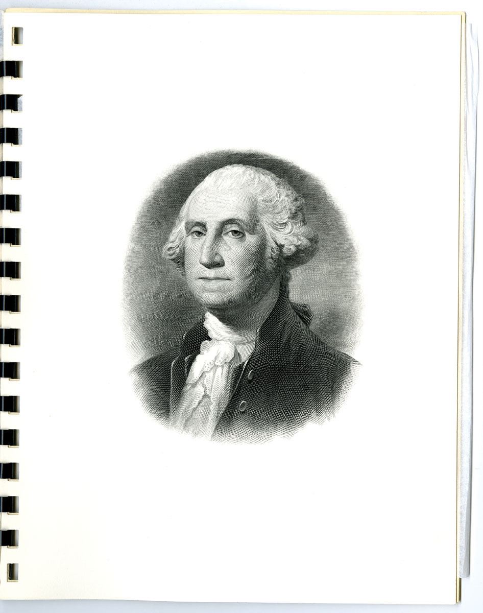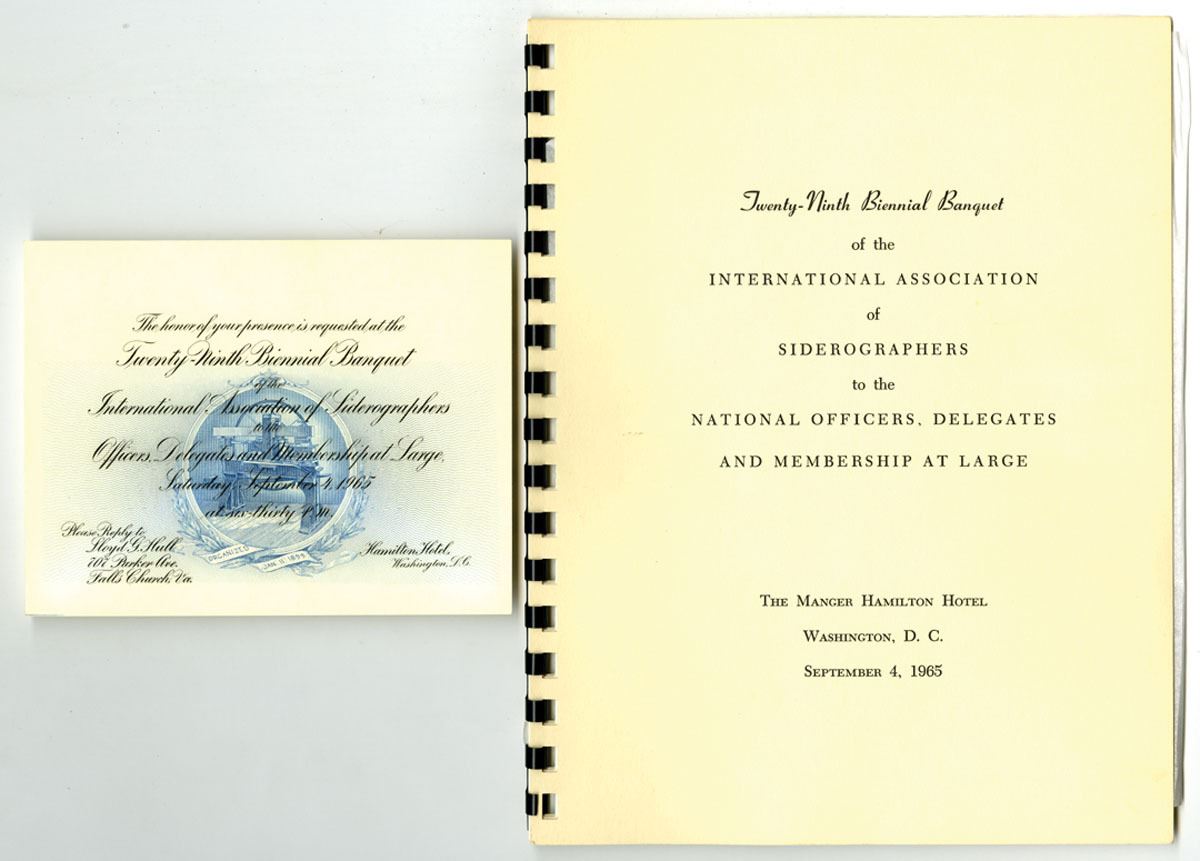 Washington D.C., 1965. Official program booklet and invitation for the Twenty-Ninth Biennial Banquet of the International Association of Siderographers, held September 4, 1965 at the Manger Hamilton Hotel, Washington, D.C., bound in plastic comb with printed title cover, the interior includes a large portrait of George Washington (BEP printed), and 3 U.S. postage stamps glued to the interior of the back cover of Hoover, Kennedy; and Churchill; and, an engraved invitation to the same banquet, printed in blue with union emblem with a siderography machine in the middle and ornate lettering. A scarce pair of mid-20th century union banquet security printing ephemera documenting one of the major gatherings of the siderographers’ trade. Uncirculated condition. (2).