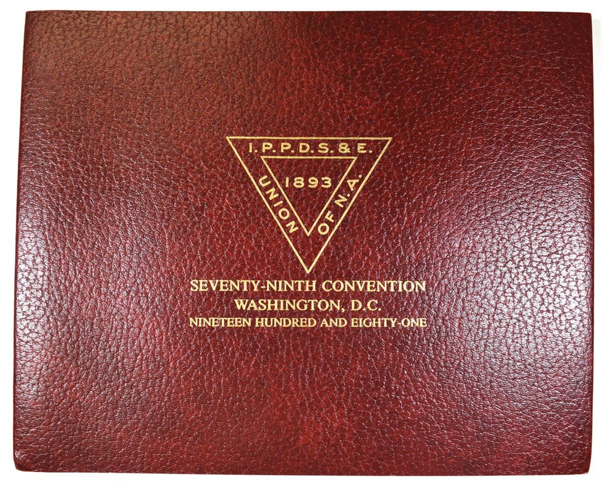 Washington D.C., 1981. Large-format, leatherette-bound souvenir volume issued for the Seventy-Ninth Convention, held in Washington, D.C., 1981. Gilt-stamped cover bears the triangular IPPDS&E Union emblem with founding date of 1893. The interior features a finely engraved title page of a seated woman flanked by 2 men under the title of the Union with the dates "1893-1981" flanking them, this card was printed by the B.E.P.; also included in the booklet is an introductory engraved plate by the director of the B.E.P.; a Treasury Department souvenir card featuring images of past and current B.E.P. buildings; an outstanding ABNC printed souvenir card featuring the well known "Reapers" vignette by Smiley; a Security-Columbian Banknote Co., Souvenir card with multiple vignettes; and other commemorative artwork, including allegorical vignettes, historic buildings of the Bureau of Engraving and Printing, the Statue of Freedom, and patriotic motifs such as the Liberty Bell, Carpenters’ Hall, and Christ Church Philadelphia. Several pages carry compliments from the Bureau of Engraving and Printing and the Security-Columbian Banknote Company, among others, highlighting the ties between the union and America’s security printing institutions. A richly produced and visually impressive late 20th-century union souvenir, reflecting both the heritage of engraving and the enduring role of the union in U.S. printing history. Condition Choice Uncirculated to Near Mint, with crisp covers, and clean pages. B.E.P.; ABNC; and others