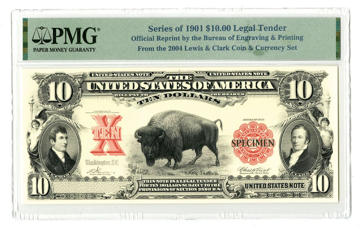 Washington D.C., 2004. $10 Legal Tender Official Reprint by the BEP from the 2004 Lewis & Clark Coin & Currency Set, Black print with red seal at right and numeral at left, Portraits of Lewis and Clark at left and right with Buffalo at center, Uniface note, in PMG holder but without grade, but is in Superb Gem Uncirculated Condition. B.E.P.