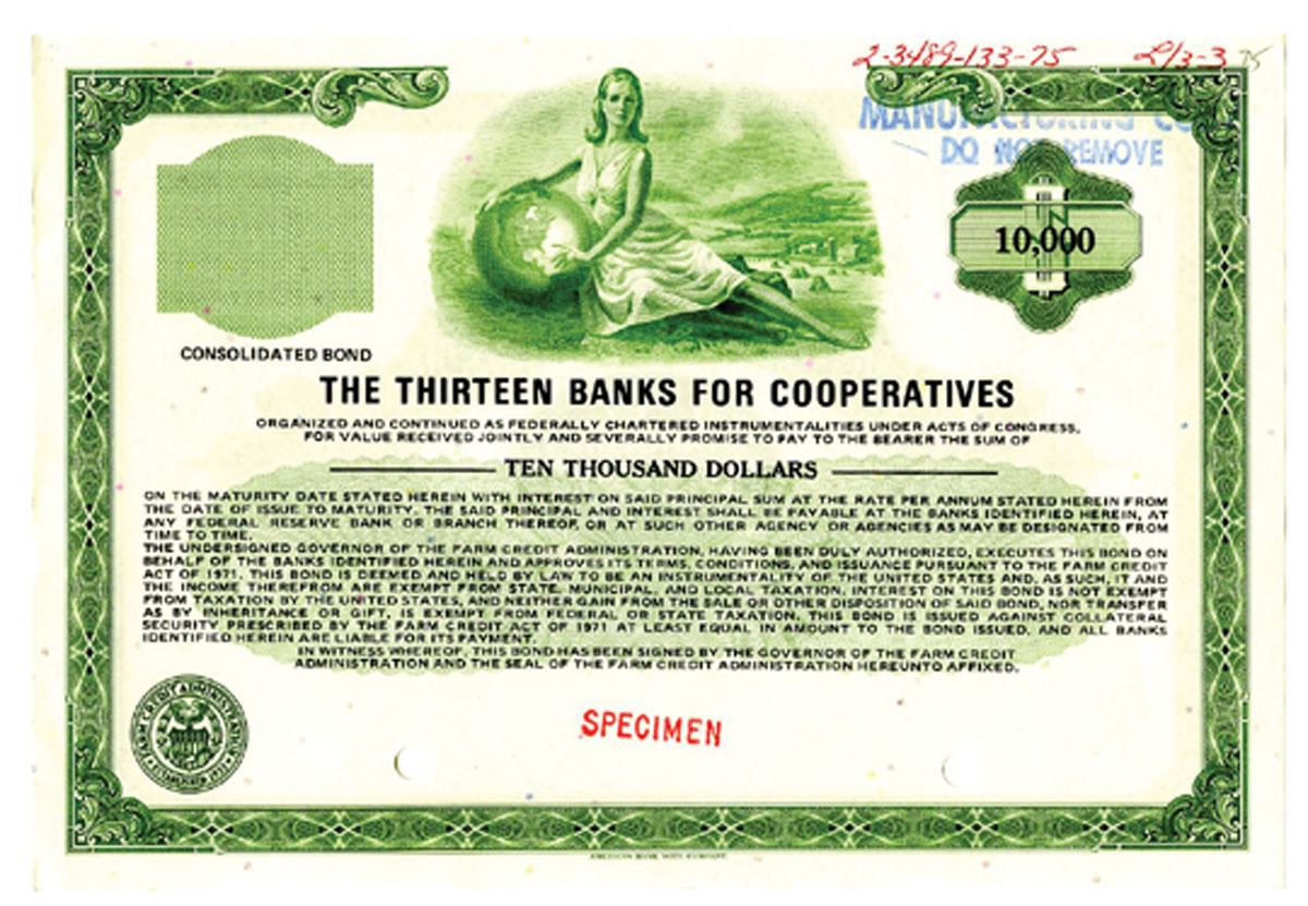 Washington, D.C.. $10,000 Specimen Odd% Consolidated Bond, Black print on green border and under tint in small sized certificate, Allegorical woman leaning on globe at top, Specimen overprints and POC's, VF-XF condition, ABNC. The Farm Credit Act of 1933, by the Congress, allows local Production Credit Associations to expand short- and intermediate-term agricultural credit availability. The act also creates 13 Banks for Cooperatives. While 12 BCs serve district territories, the 13th bank, called the Central Bank for Cooperatives, serves large accounts and those that cross district lines.