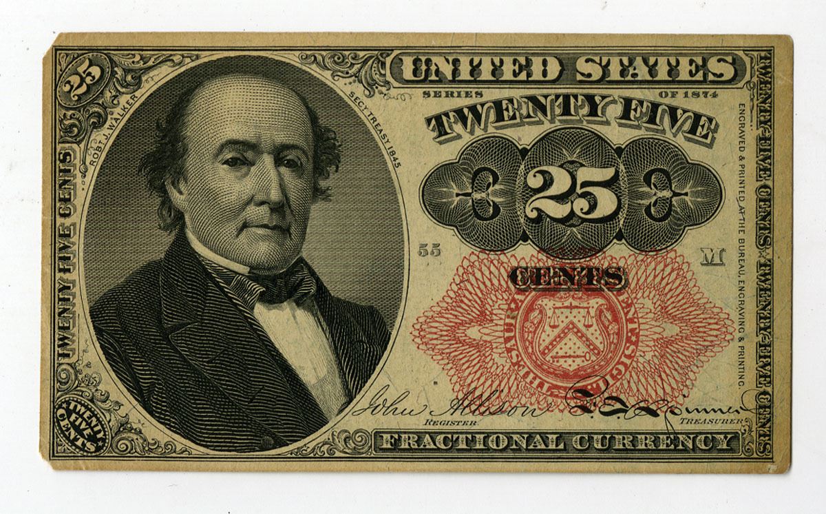 Washington, D.C., 1864. 25 Cents, P-123a, Fr.# 1308, Issued Banknote, Portrait of R. Walker at left, Red seal with long key, Back is blue/green, VF to XF condition.