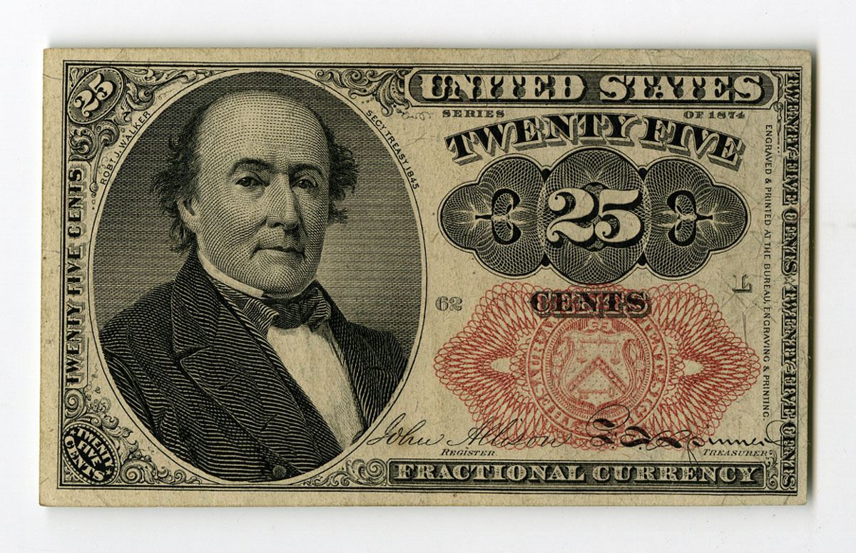 Washington, D.C., 1864. 25 Cents, P-123b, Fr.# 1309, Issued Banknote, Portrait of R. Walker at left, Red seal with short key, Back is blue/green, VF to XF condition.