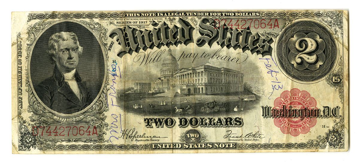 Washington, D.C., 1917. $2, P-188, Series of 1917, Fr.#60, Issued Banknote, Black printing with red scalloped seal at right, Speelman | White signatures, S/N D74427064A pp H766/246, Note is in Good to Fine condition with print missing from top left corner and stains.