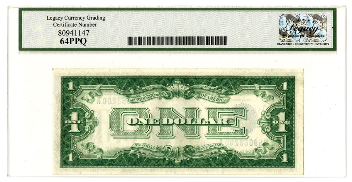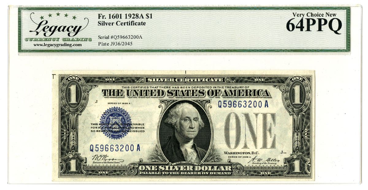 Washington D.C., $1, P-412a, Series of 1928A, Fr.1601, Issued Banknote, Woods | Mellon Signatures, Small blue seal at left, S/N Q59663200A pp J936/2045, Legacy graded Very Choice New 64PPQ.