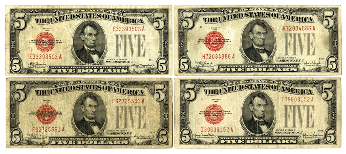 Washington D.C., 1928. Lot of 4 Issued Banknotes, Includes: $5, P-379b, Series of 1928B, Fr.# 1527, Julian | Morgenthau Signatures; $5, P-379c, Series of 1928C, Fr.# 1528, Julian | Morgenthau Signatures; $5, P-379e, Series of 1928E, Fr.# 1530, Julian | Snyder Signatures; $5, P-379f, Series of 1928F, Fr.# 1531W, Clark | Snyder Signatures. All have red seal at left and range from Fine to VF condition. (4). Sold "AS IS" no returns accepted.