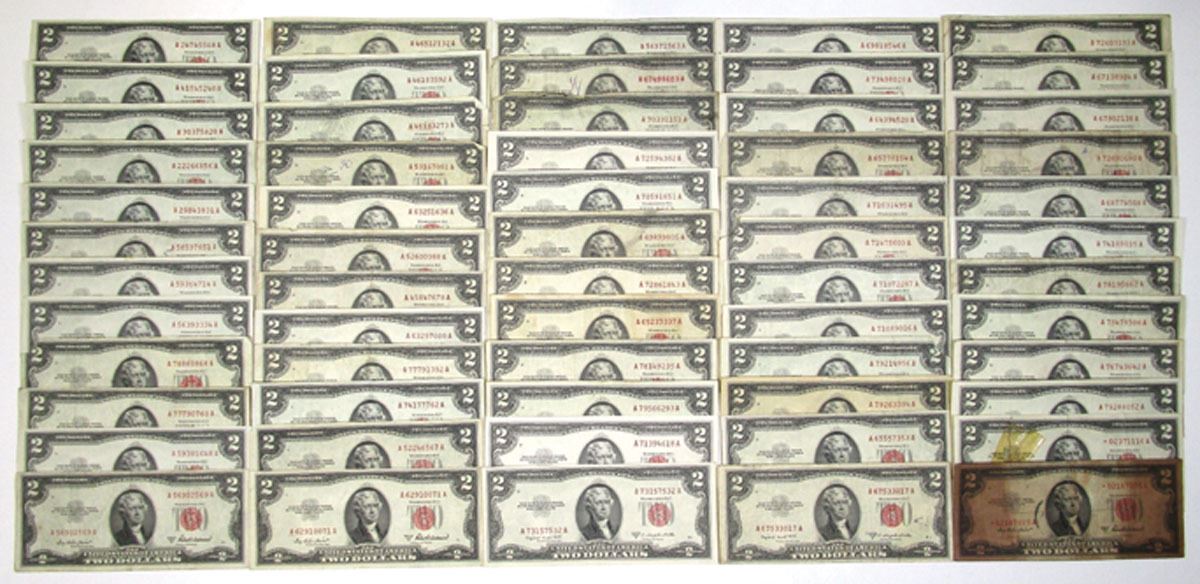 Washington D.C., 1953. Lot of 55+ Issued Banknotes, Includes: 2 Dollars, P-380 (5) Fr.# 1509, Series of 1953; 2 Dollars P-380a (18) Fr.# 1510, Series of 1953A; 2 Dollars, P-380b (24) Fr.# 1511, Series of 1953B; 2 Dollars, P-380c (13) Fr.# 1512, Series of 1953C. Notes all have Thomas Jefferson at center with Red seal at right. Notes range from Fine to XF condition. Face Value is $120. (60). Sold "AS IS" no returns accepted.