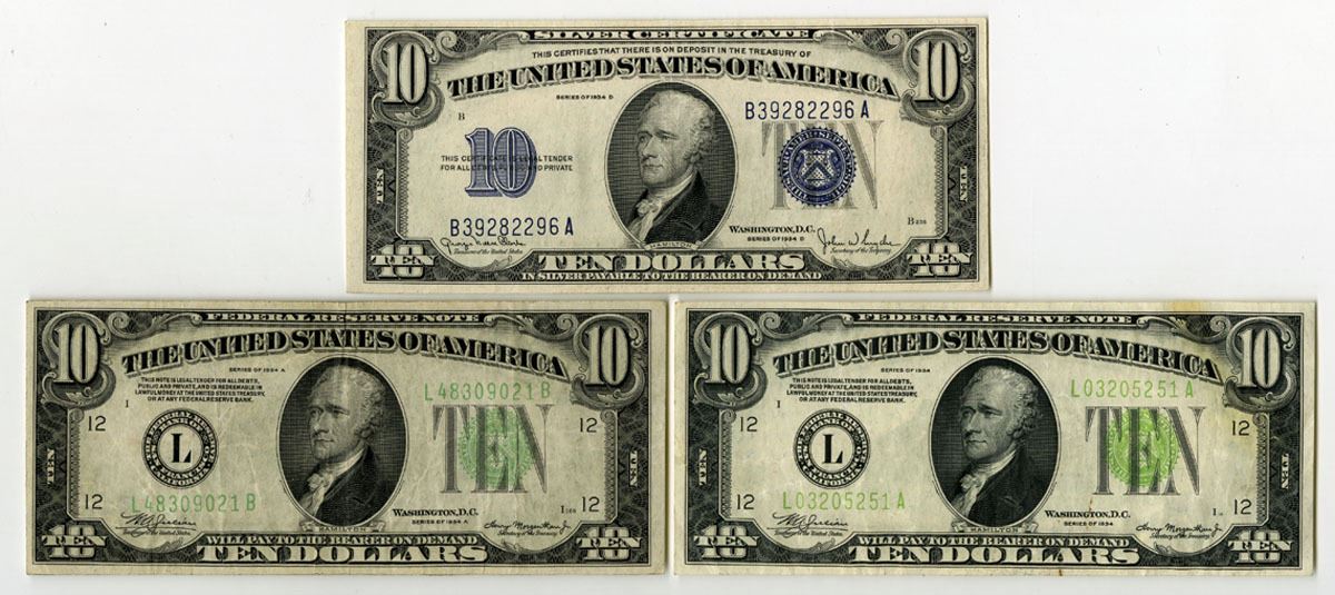 California and Washington, D.C., 1934. Lot of 3 Issued Banknotes, Includes: $10 Silver Certificate, P-415d, Series of 1934D, Fr.# 1705, Clark | Snyder Signatures, Blue seal at right; $10 Federal Reserve Note - San Francisco, CA, P-430Da, Series of 1934A, Fr.# 2006-L, Julian | Morgenthau Signatures, Dark green seal at right; $10 Federal Reserve Note - San Francisco, CA, P-430L, Series of 1934, Fr.# 2004-L, Julian | Morgenthau Signatures, Light green seal at right. Notes range from VF to XF condition. (3). Sold "AS IS" no returns accepted.