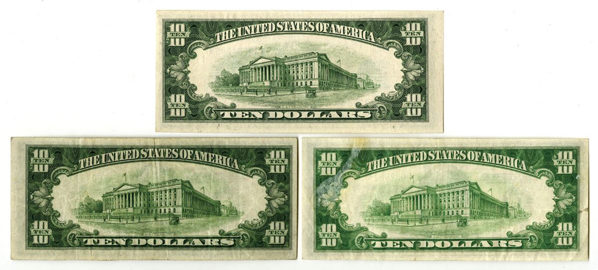California and Washington, D.C., 1934. Lot of 3 Issued Banknotes, Includes: $10 Silver Certificate, P-415d, Series of 1934D, Fr.# 1705, Clark | Snyder Signatures, Blue seal at right; $10 Federal Reserve Note - San Francisco, CA, P-430Da, Series of 1934A, Fr.# 2006-L, Julian | Morgenthau Signatures, Dark green seal at right; $10 Federal Reserve Note - San Francisco, CA, P-430L, Series of 1934, Fr.# 2004-L, Julian | Morgenthau Signatures, Light green seal at right. Notes range from VF to XF condition. (3). Sold "AS IS" no returns accepted.