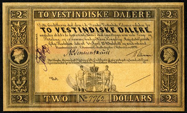 D.W.I., State Treasury, Law of 4.4.1849 & 1898 Remainder. Danish West Indies, L. 1849 & 1898, 2 Dalere, P-8r, Remainder, Black on light brown, Mercury and Zeus on left and right border, PMG graded Choice Uncirculated 64, S/N 7762, attractive note from a Caribbean U.S. Territory. Rarely seen this nice.