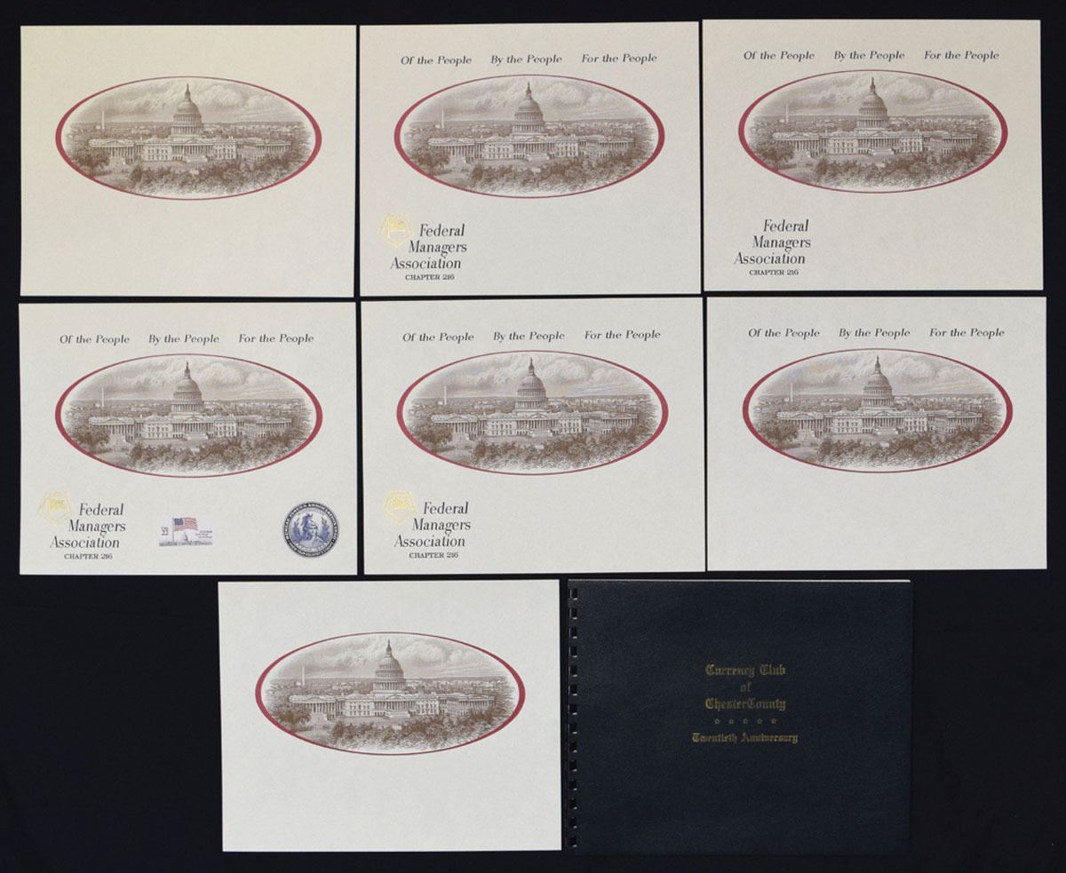 Washington, D.C, and Pennsylvania. Lot of 8 items, Includes: 7 progress proofs or printing separations of the different elements of the Federal Managers Association, Chapter 216, souvenir cards, All feature an engraved vignette of the U.S. Capitol and the motto “Of the People, By the People, For the People” and other have variations of the vignette at center with different elements of the card printed; and, the Great Eastern Numismatic Association, Inc., 29th Annual Convention & Third International Paper Money Convention Progress proof booklet of the souvenir card that is in a spiral-bound souvenir 9 page booklet honoring the Currency Club of Chester County, booklet includes historical notes and vignette illustrations. All are in Mint condition as printed. (8 items includes multi page cards in booklet).