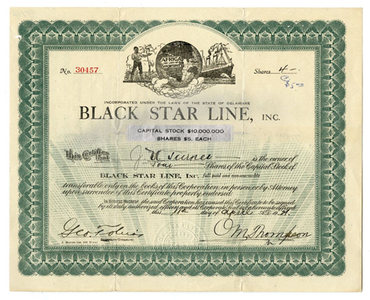 Delaware, 1921. 4 Shares, I/U Capital Stock Certificate, Black with green border and underprint, Vignette above title shows man on the left pointing to a globe with the continent of Africa prominent with text reading 'Africa the Land of Opportunity' and an ocean liner with two smoke stacks to right, Signed by George Tobias as Secretary and Orland M. Thompson as President. Certificate is in Fine to VF+ condition with staple holes and splits at fold lines. The Black Star Line, Inc. was founded in 1919 by Marcus Garvey and the Universal Negro Improvement Association as a bold effort to establish Black-owned shipping and trade. Although short-lived, ending by the mid-1920s due to financial and legal troubles, the company became a powerful symbol of Pan-African pride and economic independence, inspiring future movements for Black enterprise and self-determination.