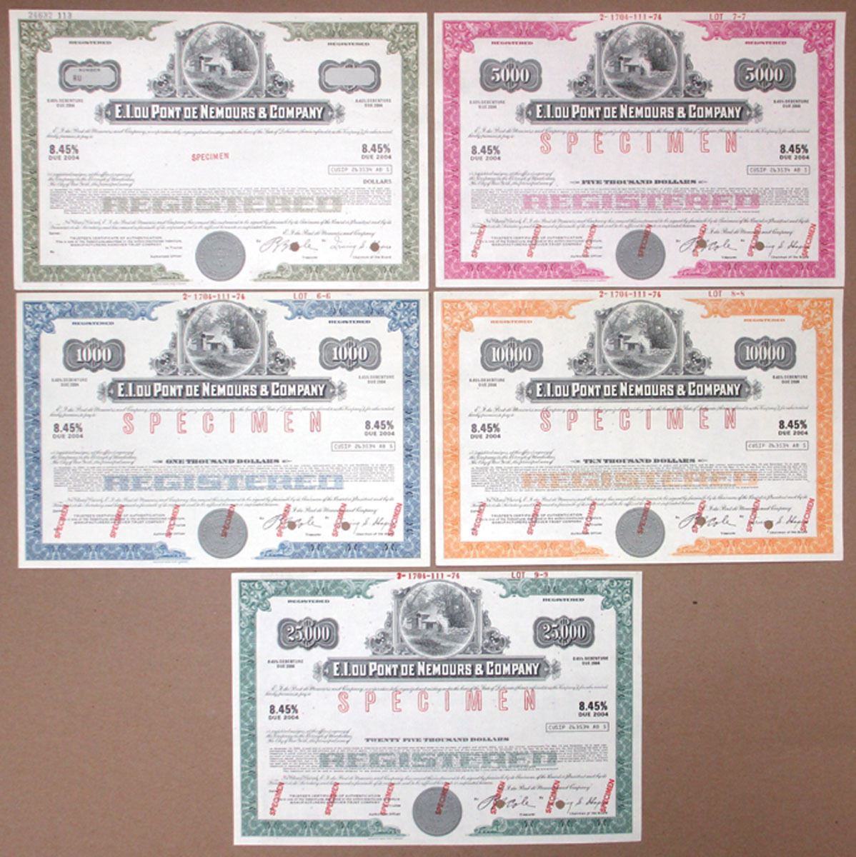 Delaware, 1974. Lot of 5 Registered 8.45% Specimen Bonds: $-Odd in Olive, $1000 in Blue, $5000 in Pink, $10,000 in Green, and $25,000 in Green. Bonds all have Specimen overprints, POCs, are in UNC to Gem UNC condition, and printed by ABNC. (5). Sold "AS IS" no returns accepted.