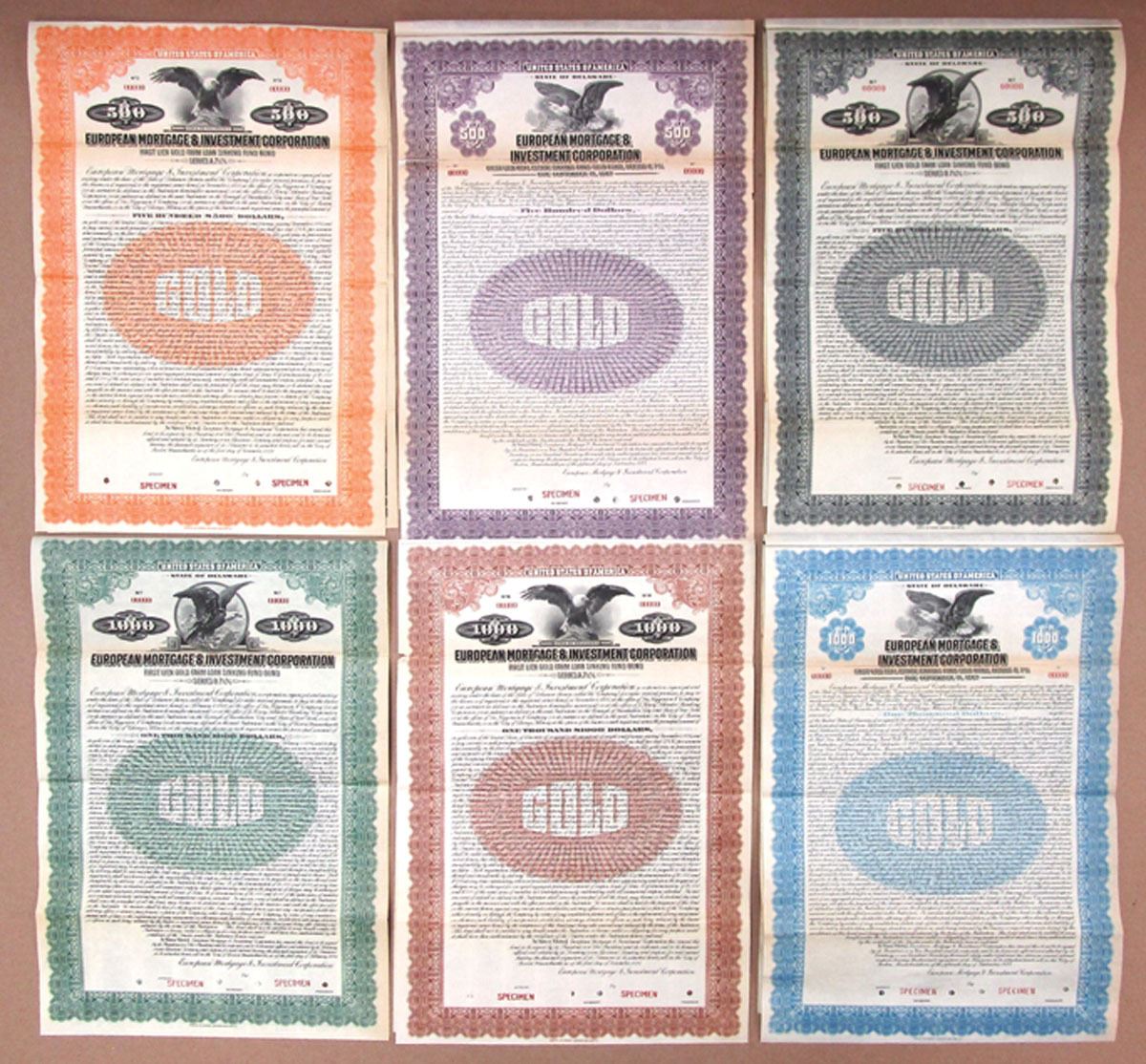 Delaware, 1925 to 1927, Lot of 6 Specimen Gold Coupon bonds, Includes: 1925, $500 Series A 7 1/2% First Lien Gold Farm Loan Sinking Fund Coupon Bond, Black with orange border; 1925, $1000 Series A 7 1/2% First Lien Gold Farm Loan Sinking Fund Coupon Bond, Black with brown border; 1926, $500 Series B 7 1/2% First Lien Gold Farm Loan Sinking Fund Coupon Bond, Black with gray border; 1926, $1000 Series B 7 1/2% First Lien Gold Farm Loan Sinking Fund Coupon Bond, Black with green border; 1927, $500 Series C 7% First Lien Real Estate Sinking Fund Gold Coupon Bond, Black with purple border; 1927, $1000 Series C 7% First Lien Real Estate Sinking Fund Gold Coupon Bond, Black with blue border. All have Bald Eagle at top center, Specimen overprints, POCs, are in Fine to VF+ condition with archival reinforcements, and printed by Franklin Lee Division - ABNC. (6). Sold "AS IS" no returns accepted. The European Mortgage & Investment Corporation (EMIC) was a prominent financial institution during the early 20th century, with its roots primarily in Europe. By the mid-1920s, Europe was undergoing significant economic shifts following the devastation of World War I, and the recovery from the war's economic aftermath was a key factor in the success of firms like EMIC. As far as economic conditions go, the period leading up to 1925 saw increasing urbanization and the construction of large-scale housing projects, especially in places like London, Paris, and Berlin.