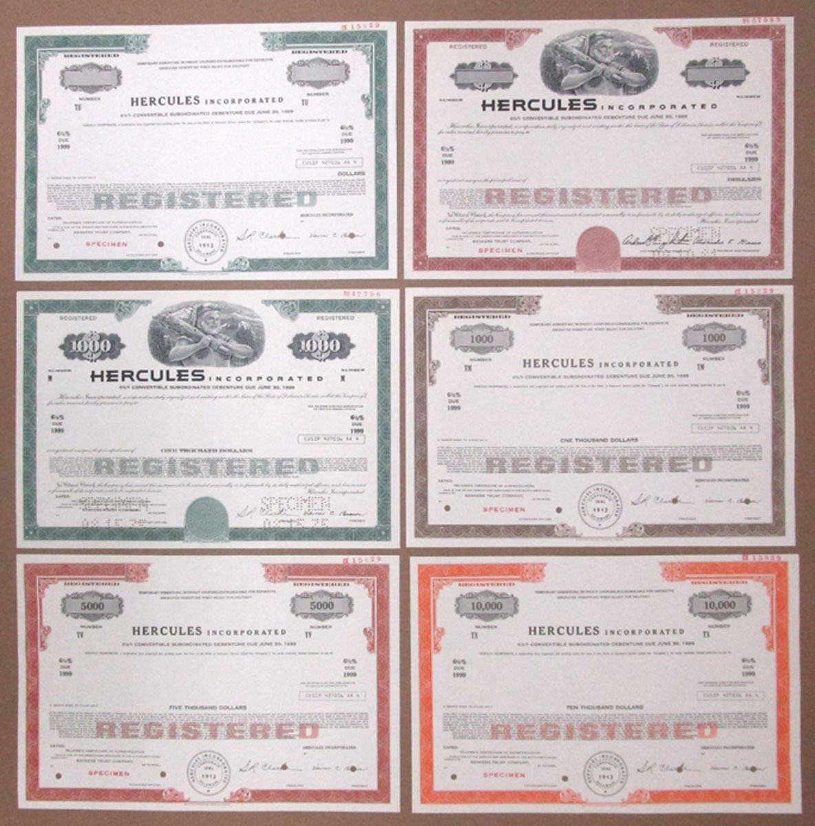 Delaware, 1974 to 1981. Lot of 6 Specimen Registered Bonds in varying colors and denominations, Some have vignette of Hercules at top, and the rest have only company title, Some are pin punched Specimen and other have Specimen overprints and POCs, Bonds range from AU to Gem Uncirculated condition. S-CBNC. (6). Sold "AS IS" no returns accepted.