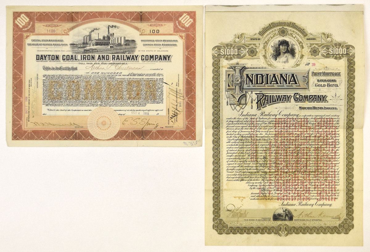 Delaware & Indiana...., 1900-1918. Lot of 2 I/U Certificates, Includes: 1900, Indiana Railway Co., $1000 I/U 5% Coupon Bond and 1918, Dayton Coal, Iron and Railway Co., 100 Shares Common Stock Certificate/ Both are in VF to XF condition. (2). Sold "AS IS" no returns accepted.