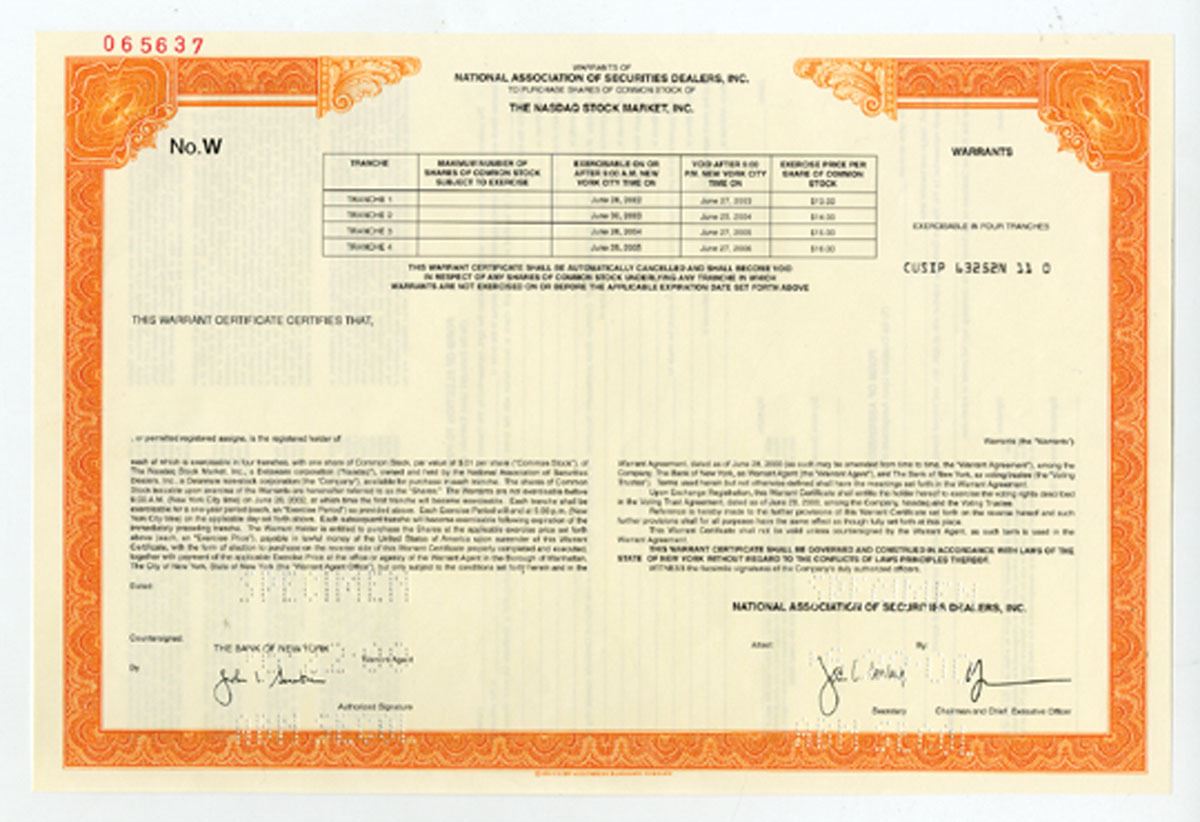 Delware. Warrants of National Association of Securities Dealers, Inc. to purchase common stock of The NASDAQ Stock Market, Inc in different tranches in 2002; 2003; 2004 and 2005 with share price between $13 to $16 per share. SCBN