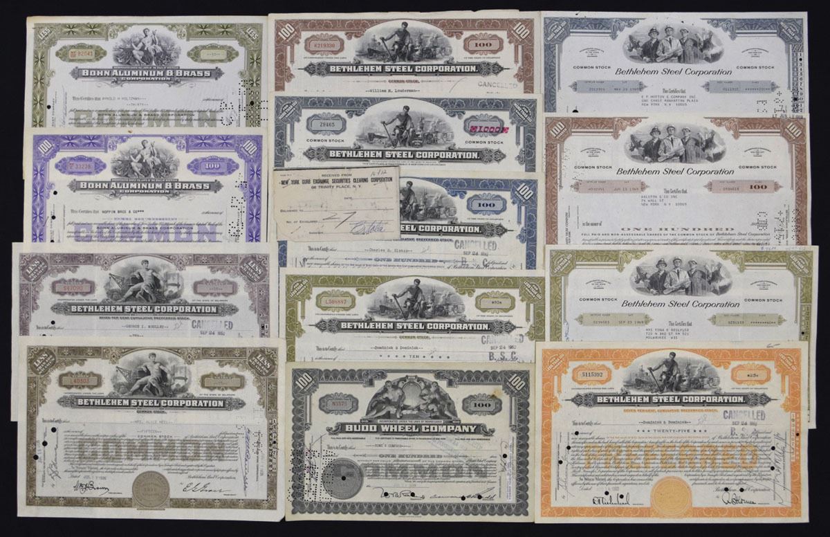 Delaware & Pennsylvania, 1930-1969. Lot of 13 I/C Stock Certificates, Includes: Bethlehem Steel Corp (10); Bohn Aluminum & Brass Corp (2); Budd Wheel Co. A strong industrial grouping dominated by Bethlehem Steel’s classic engraved vignettes featuring workers and foundry scenes, with multiple color varieties across common and preferred issues, supplemented by two attractive Bohn Aluminum & Brass certificates and a boldly designed Budd Wheel Co piece. Conditions range from Good to VF overall with typical cancellations, folds, and handling wear. (13). Sold “AS IS” no returns accepted.