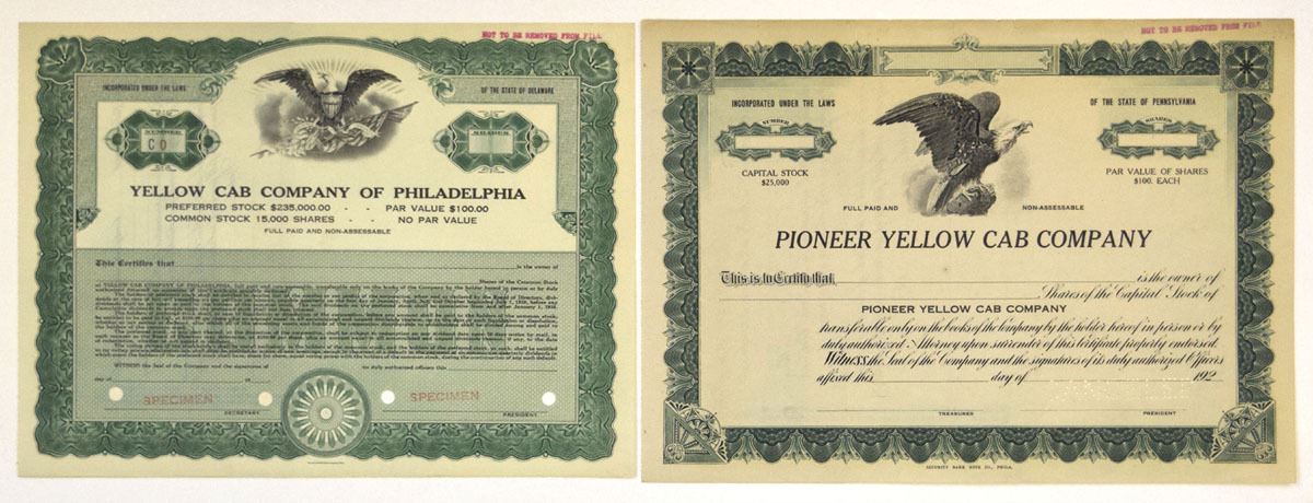 Delaware & Pennsylvania, ND (1910 to 1930s). Lot of 2 Specimen Stock Certificates, Includes: Yellow Cab Co. of Philadelphia Common Stock Cert., Black with green border and underprint, Bald Eagle at center with flag and shield at center, Specimen overprints and POCs; Pioneer Yellow Cab Co. Capital Stock Cert., Black with green border, Bald Eagle perched on rock at top center, Pin punched Cancelled. Certificates are in VF to XF condition with some splits at top. SBNC. (2). Sold "AS IS" no returns accepted.