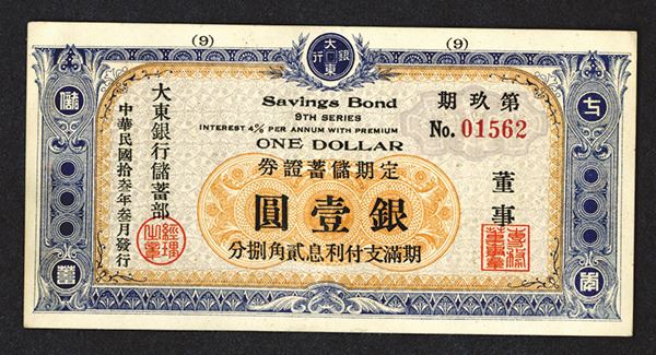 China, $1, P-Unlisted, Issued circulating bond, blue on orange and gray underprint, back red with text, S/N 01562, Rare and attractive note.